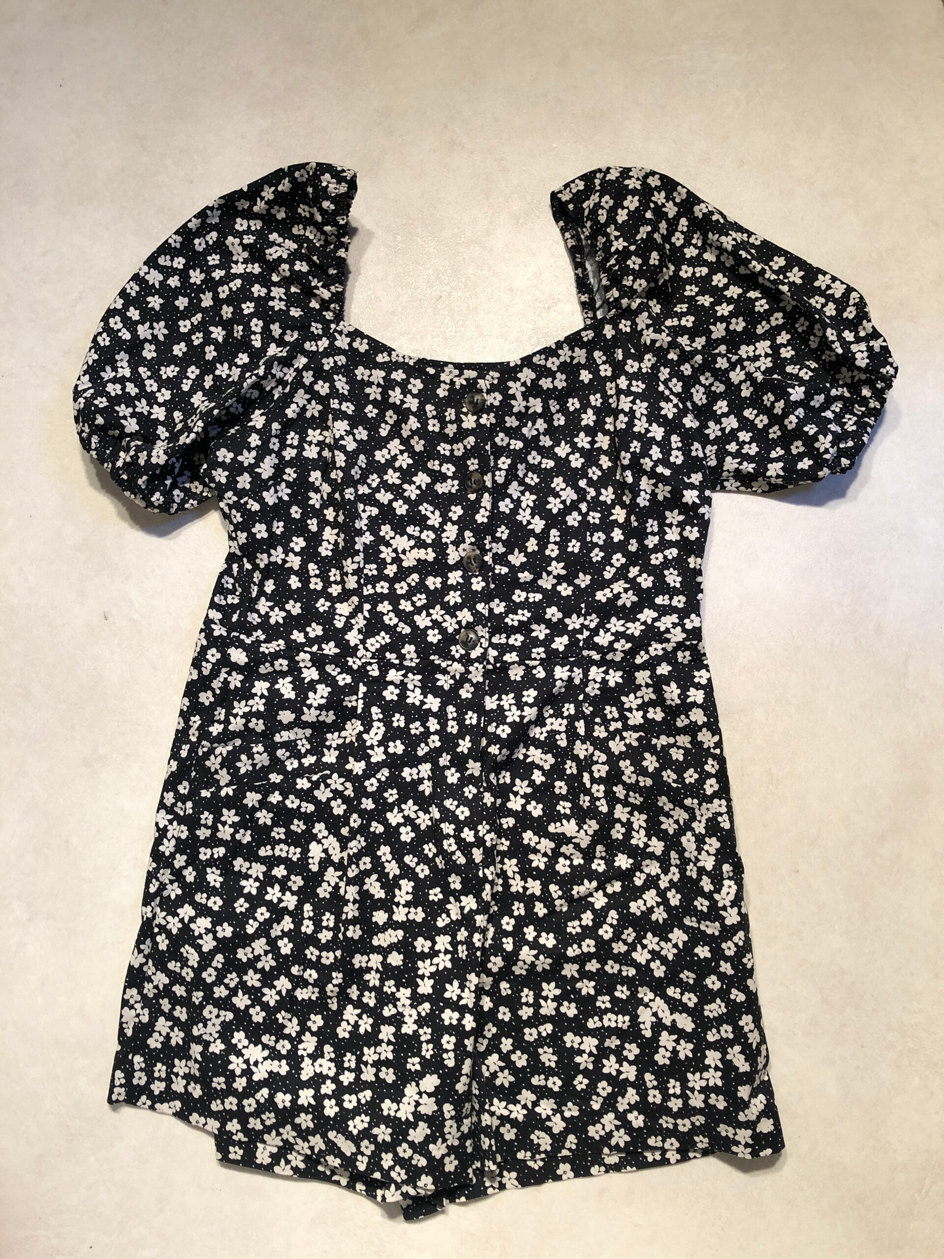 H&M zwart/crème gebloemd jumpsuit met superleuke pofmouwen maat 36