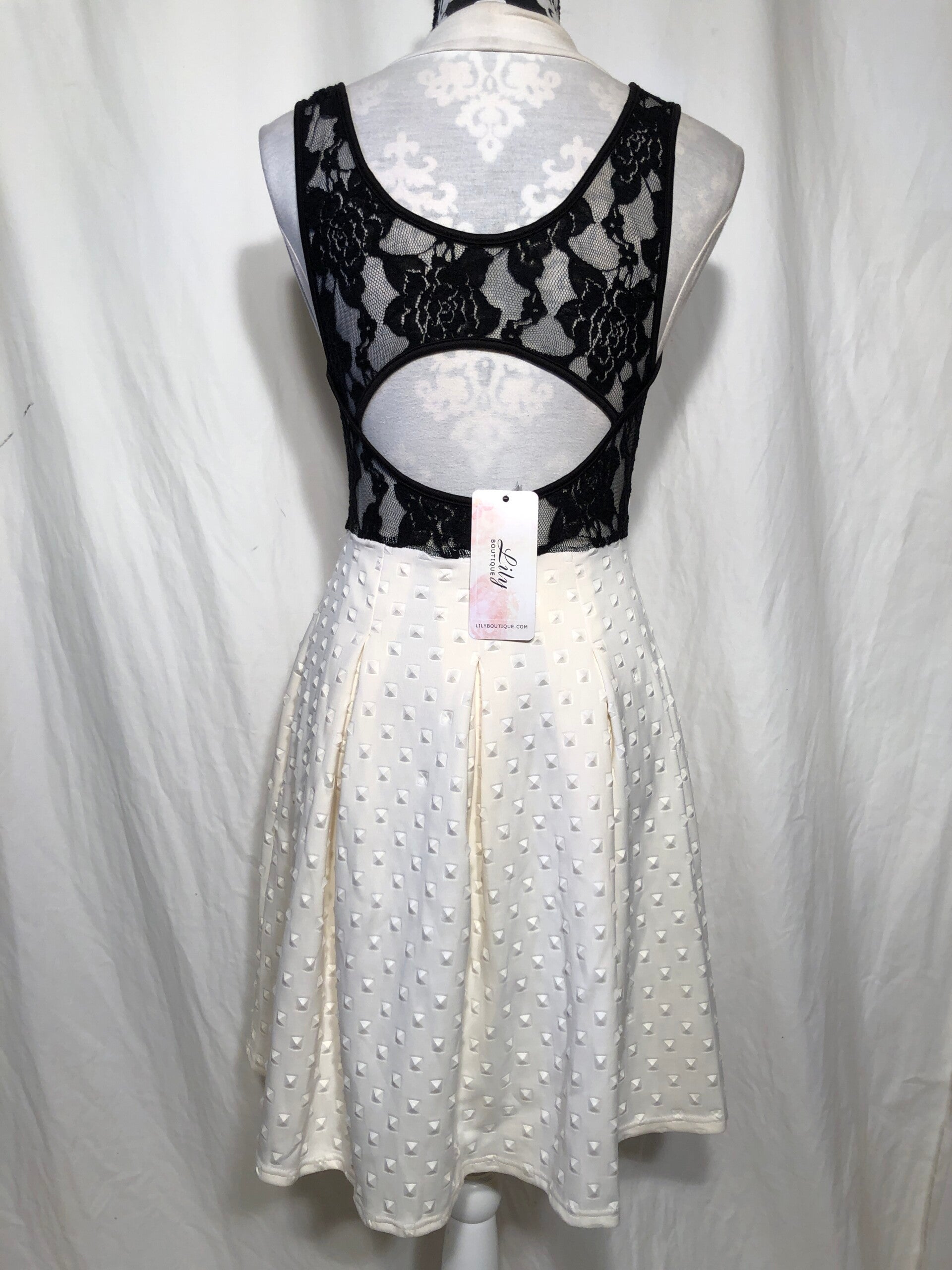 Mystic crèmekleurige teadress met rits op de voorzijde en zwart kant op de achterzijde maat S