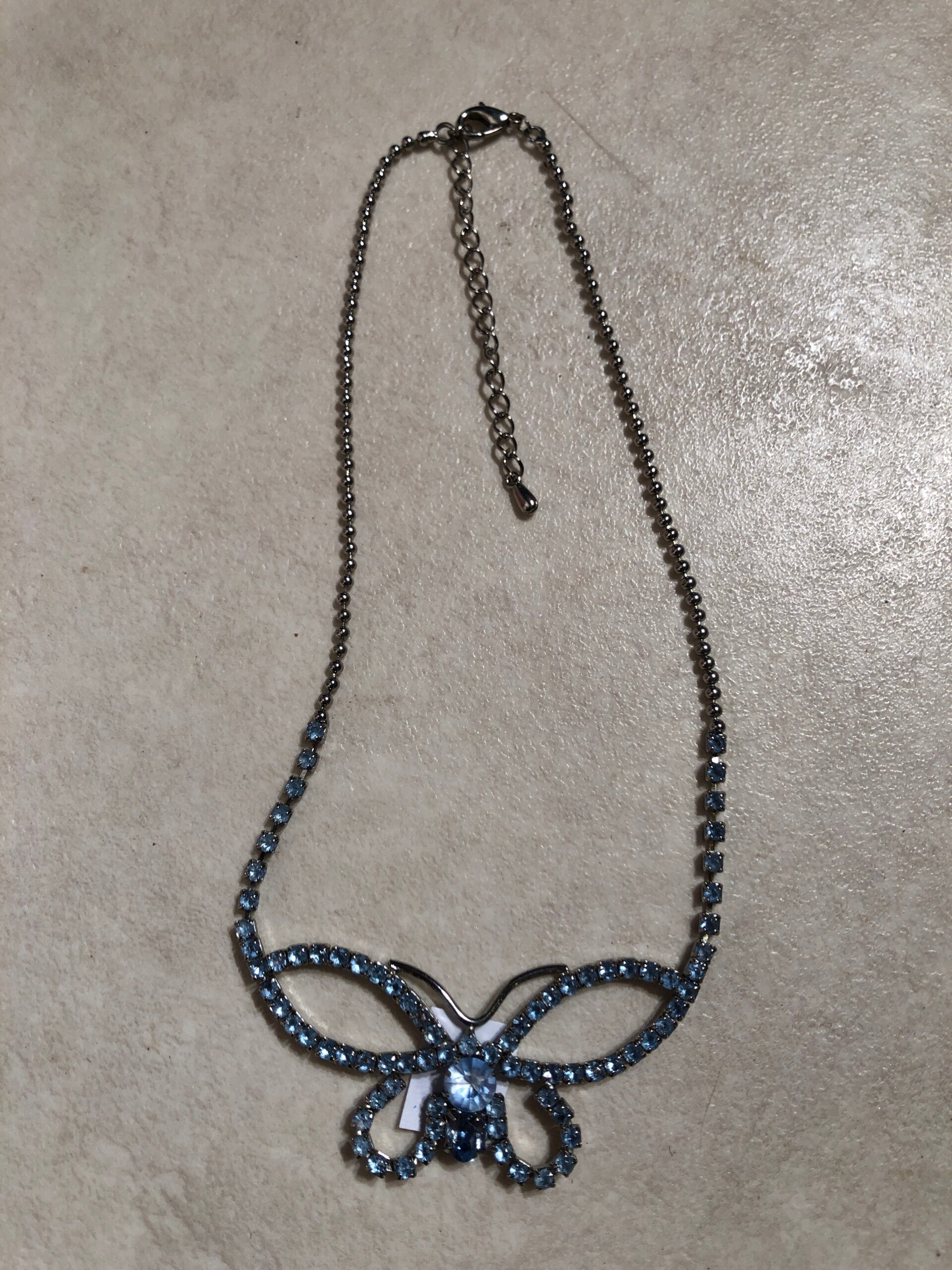 Zilverkleurige vlinder ketting met blauwe strass