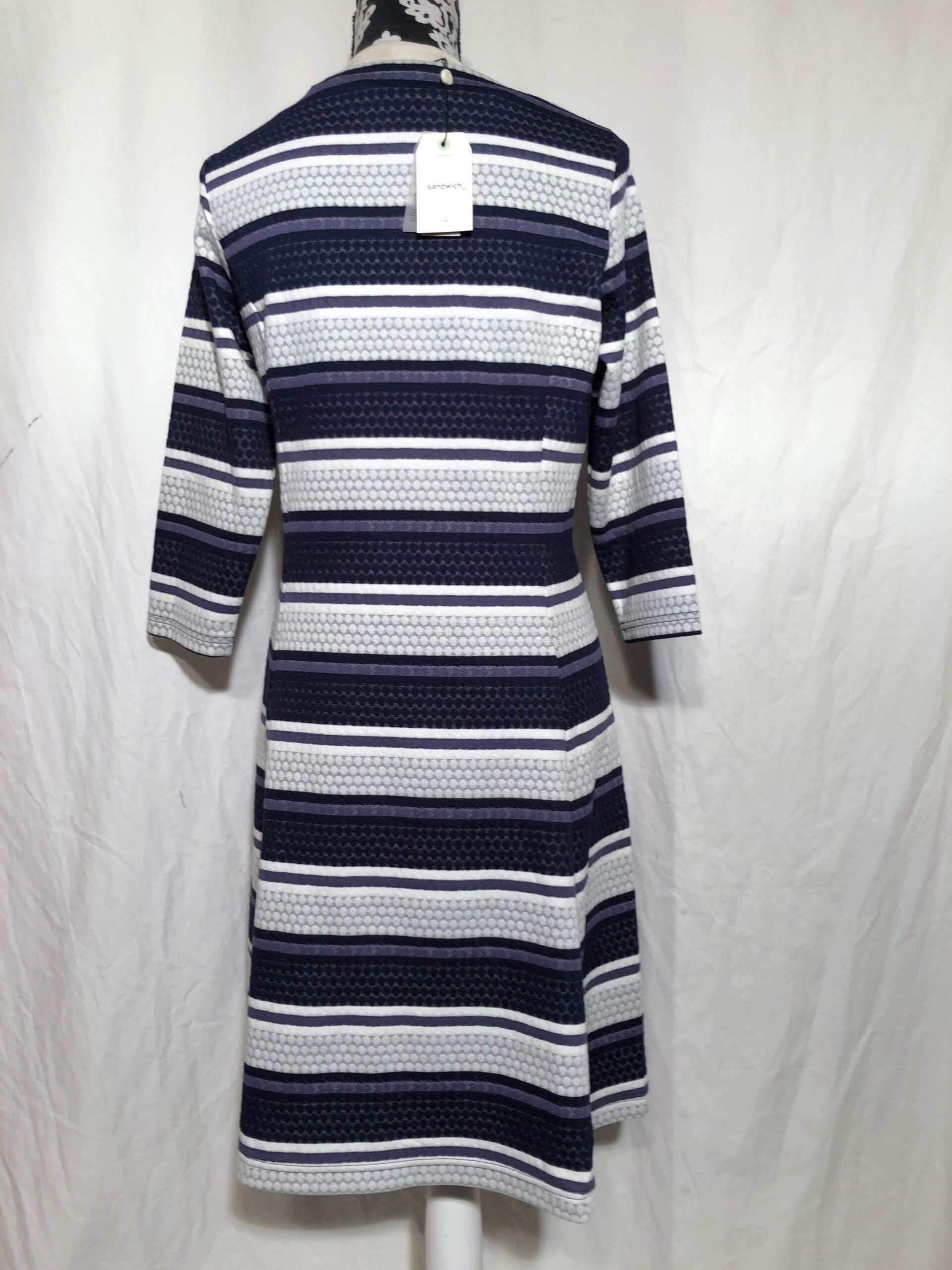 Sandwich blauw/wit gestreepte jurk met driekwart mouwen en vetertjes op de schouders maat L