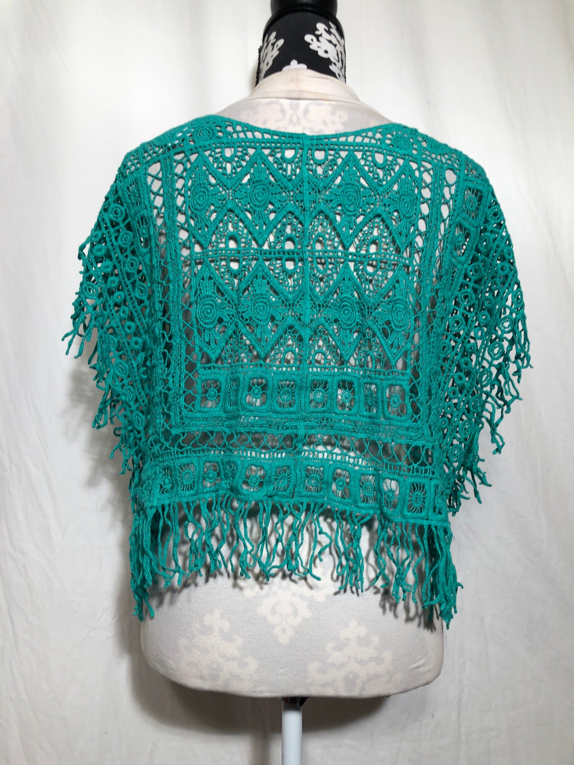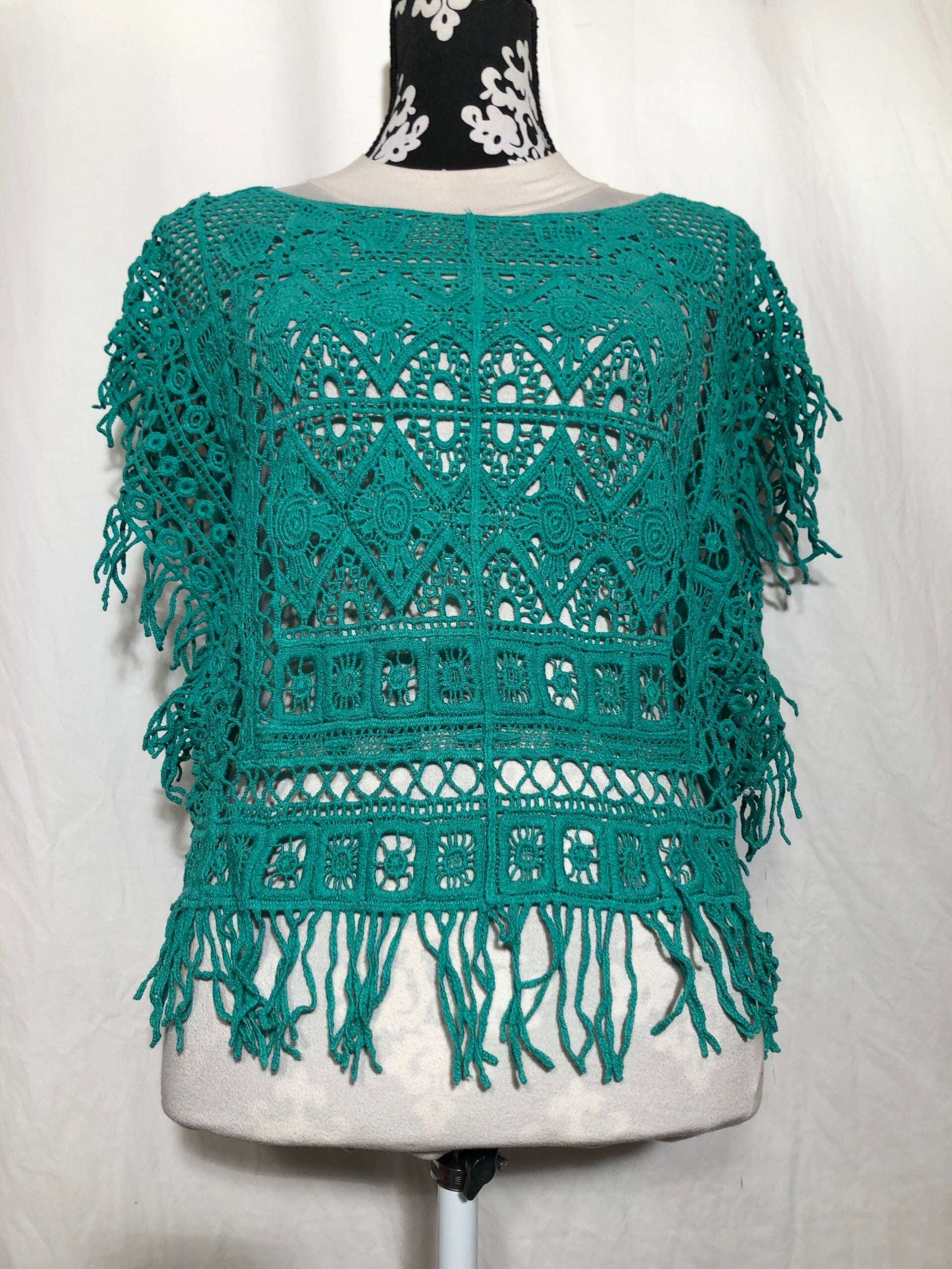 Groen gehaakt zomer truitje met raffles langs de mouwen en onderkant maat M/L