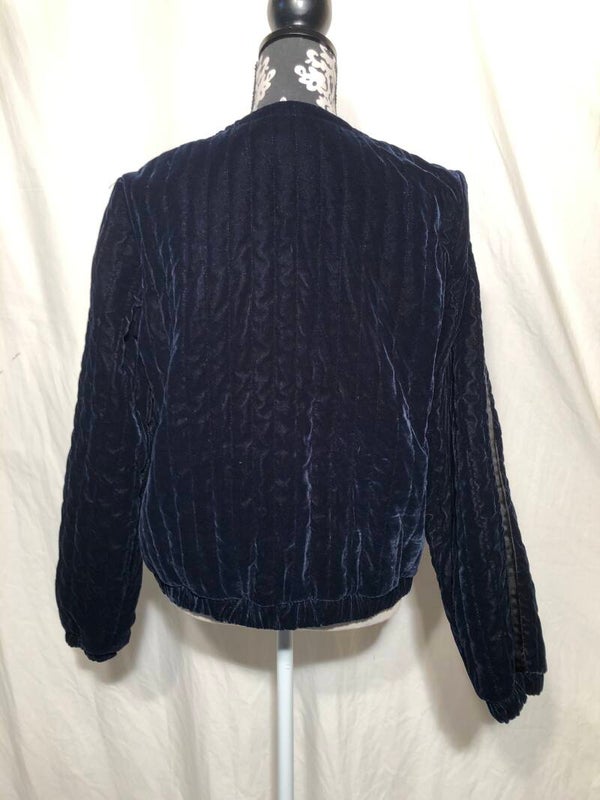 Eksept donkerblauw velours jasje met zwarte biesjes op de mouwen maat XL