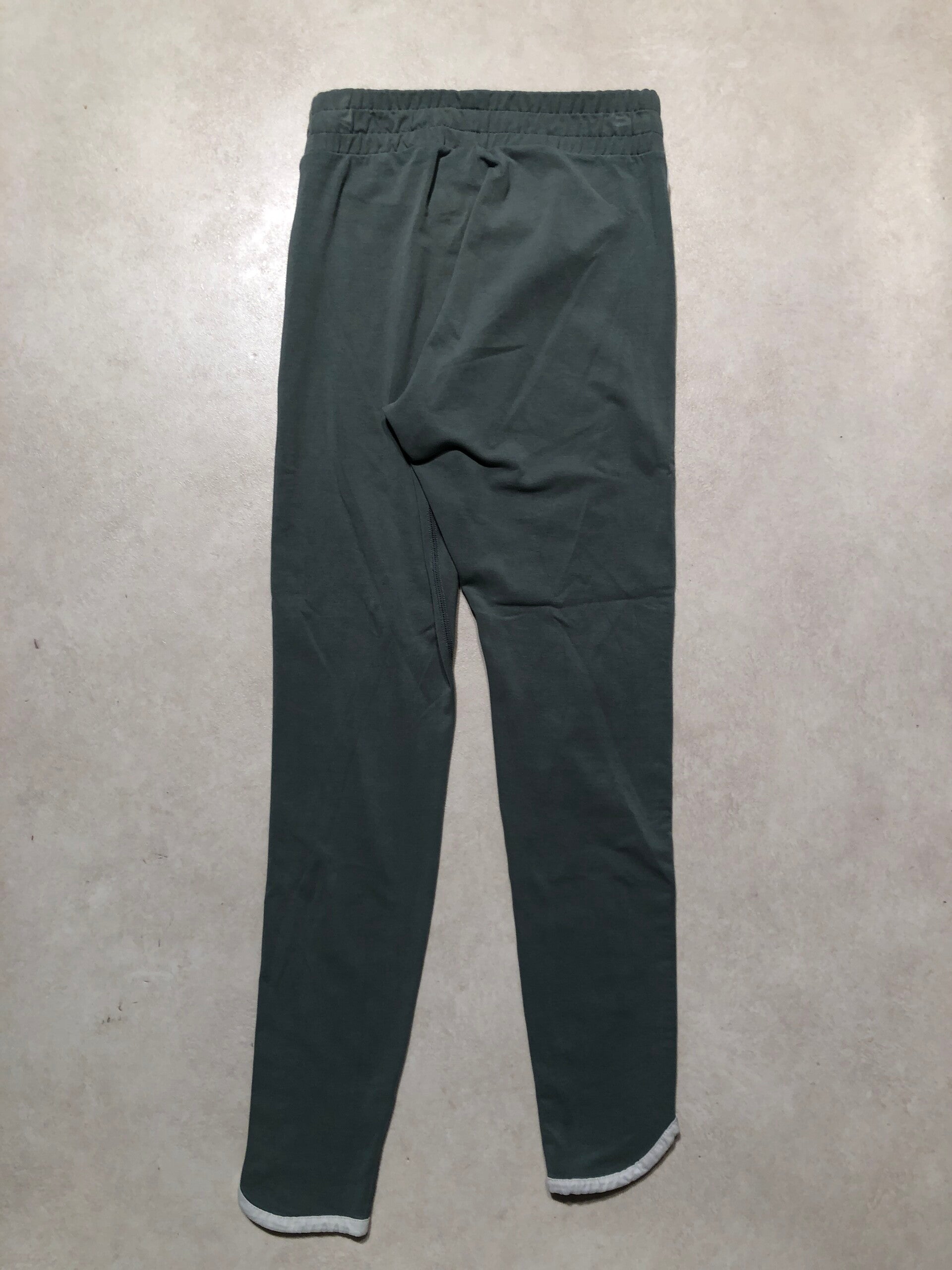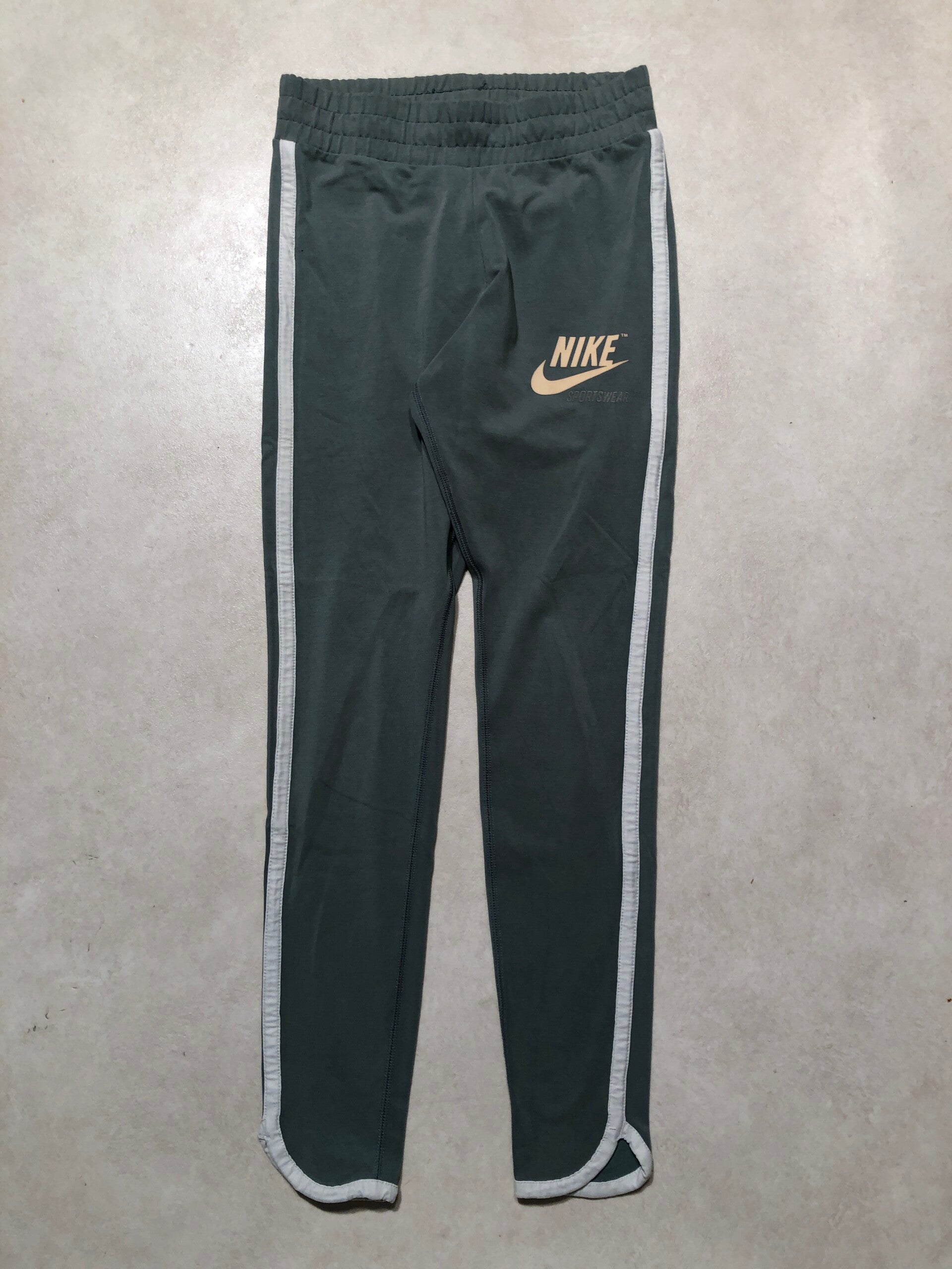 Nike groene sportbroek met crèmekleurige biezen op de zij en opdruk op de voorzijde maat S