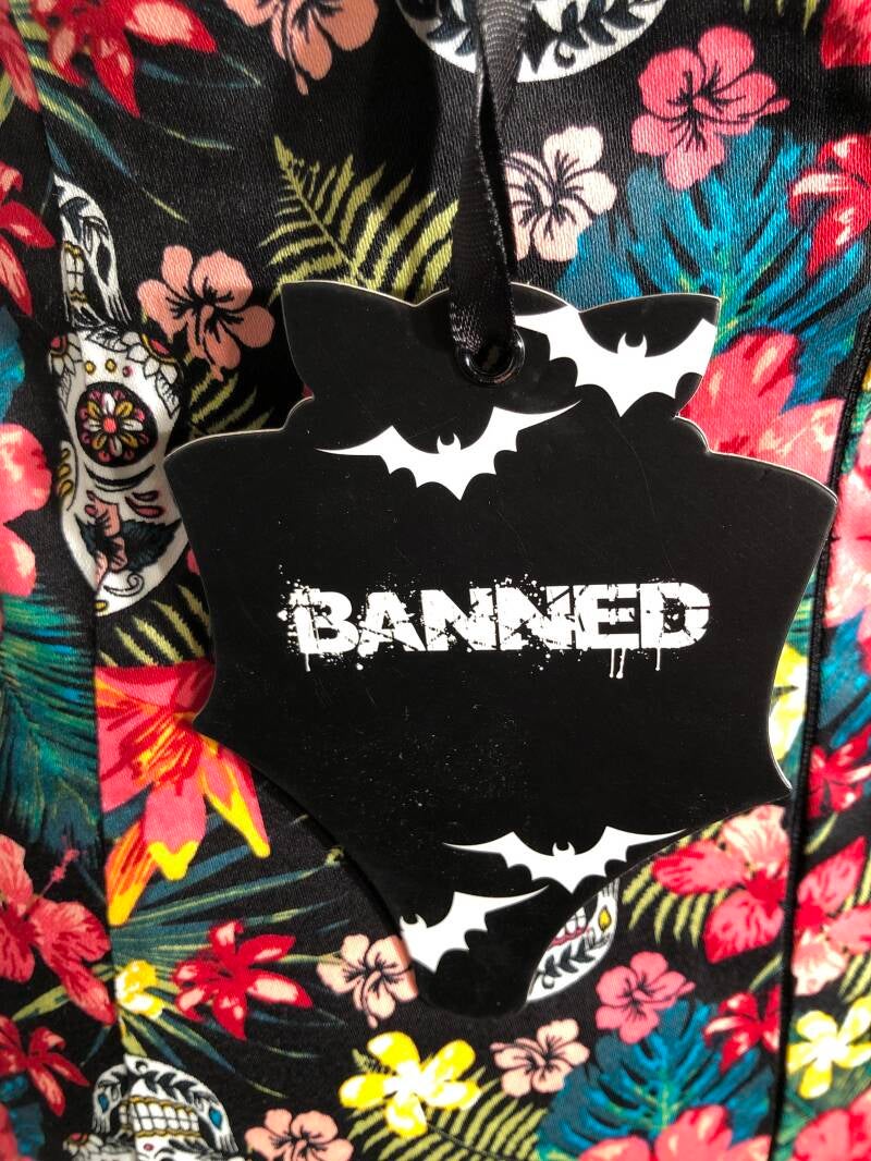 Banned alternative zwart retro kokerrok met skulls en bloemen maat L