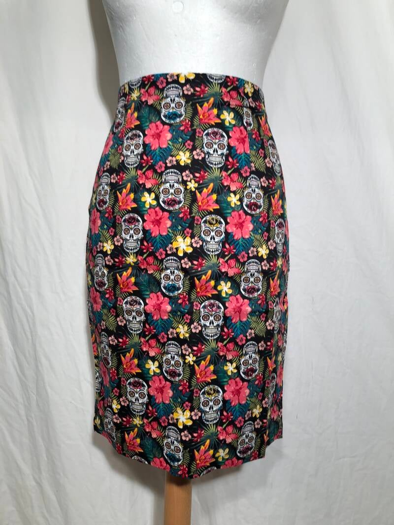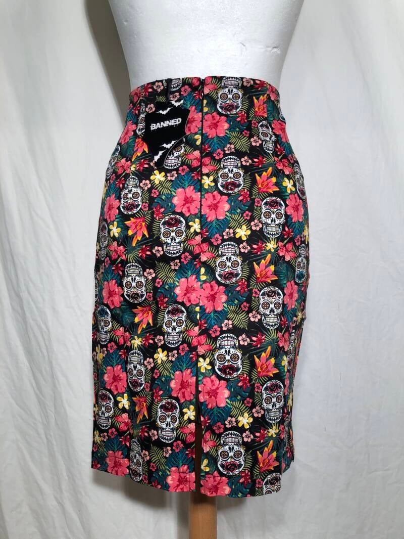 Banned alternative zwarte retro kokerrok met skulls en bloemen maat L