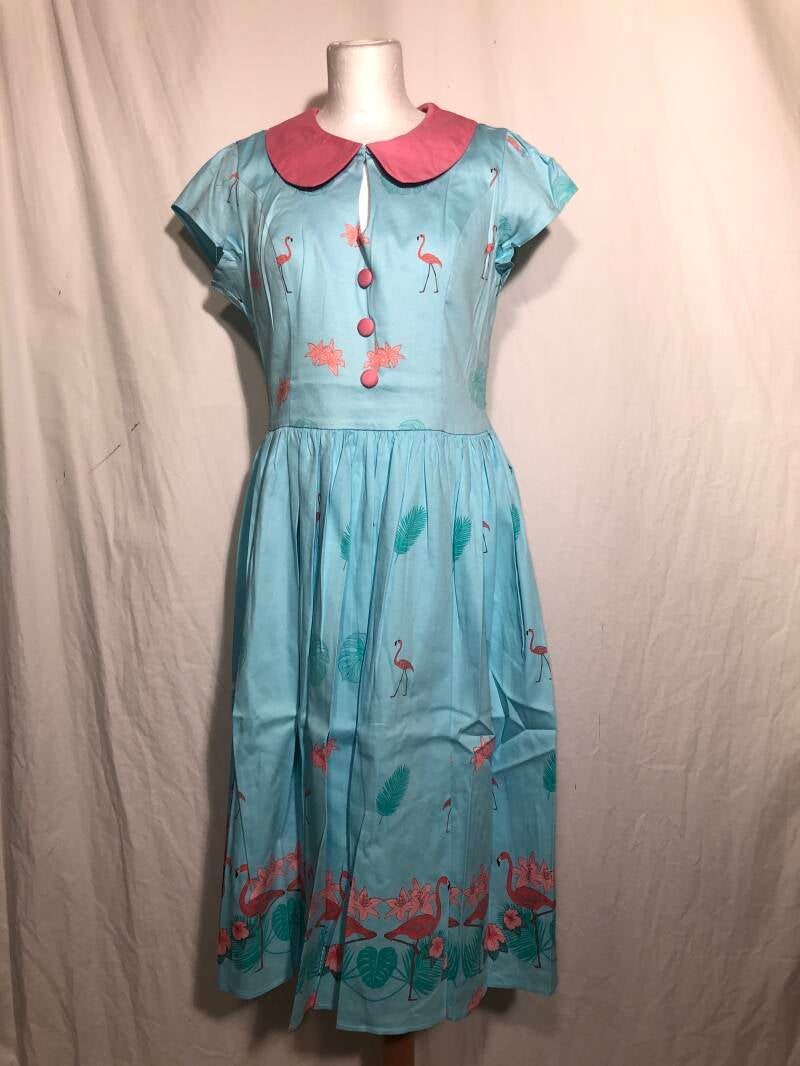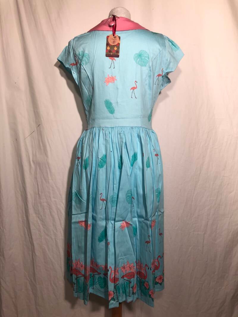 Dancing days by Banned lichtblauwe retro swingdress met flamingo's, roze kraag en roze sierknoopjes maat L
