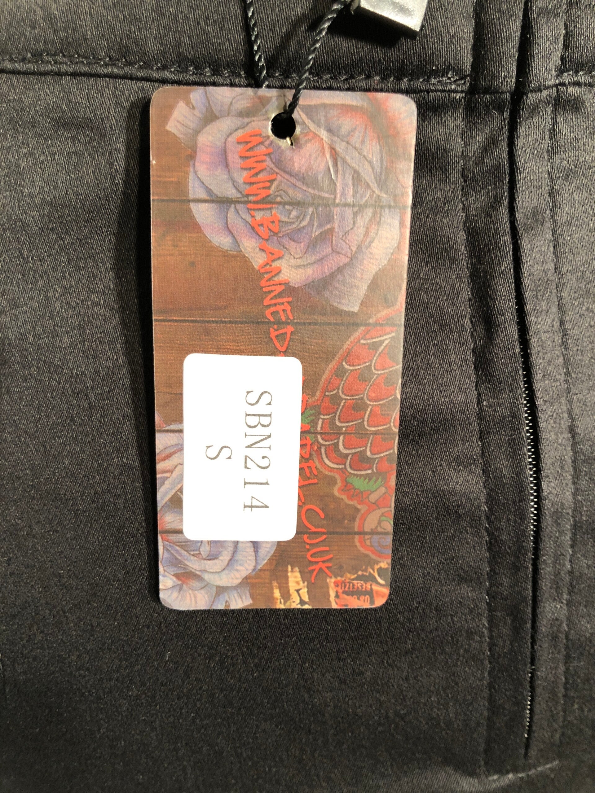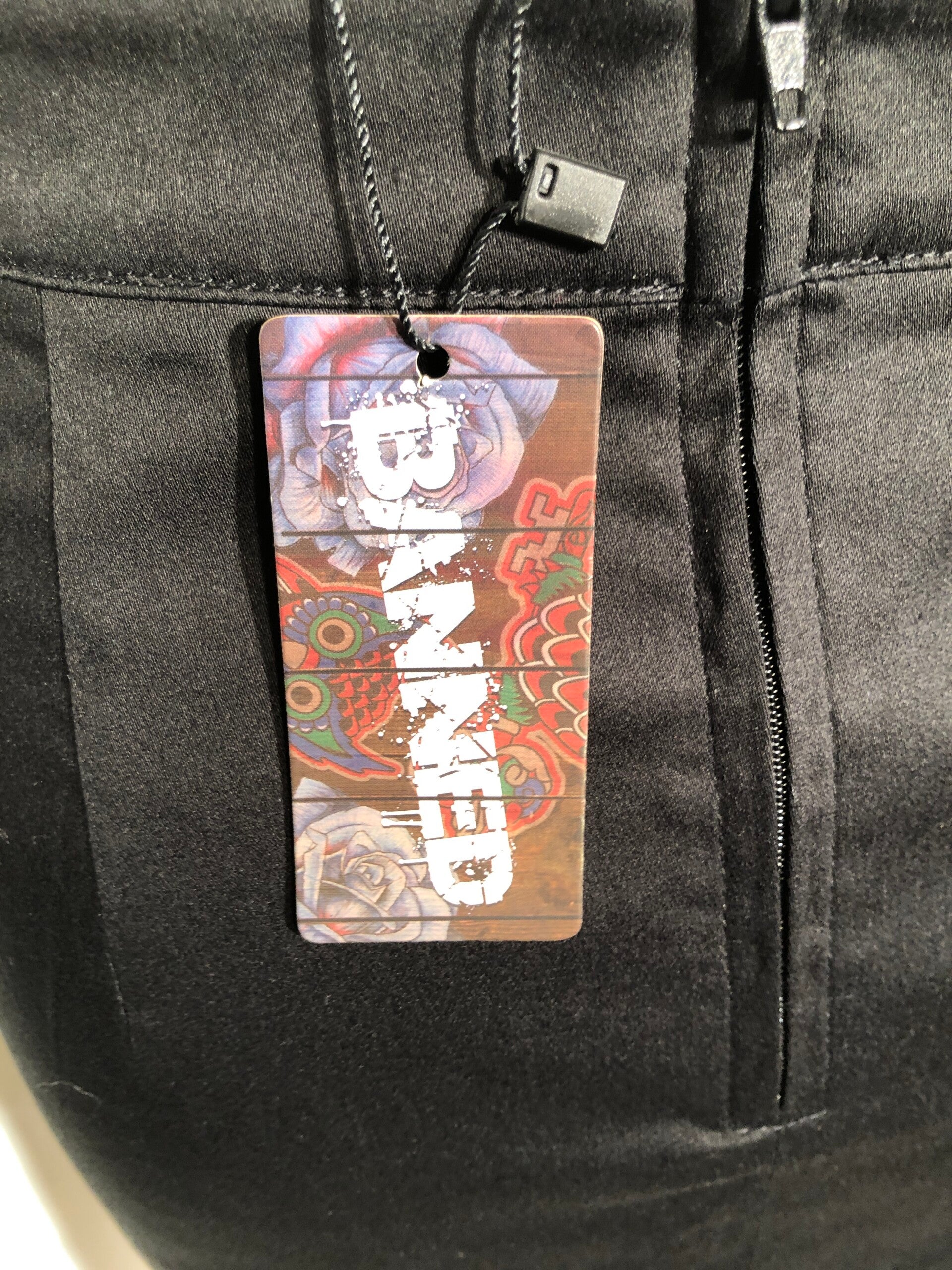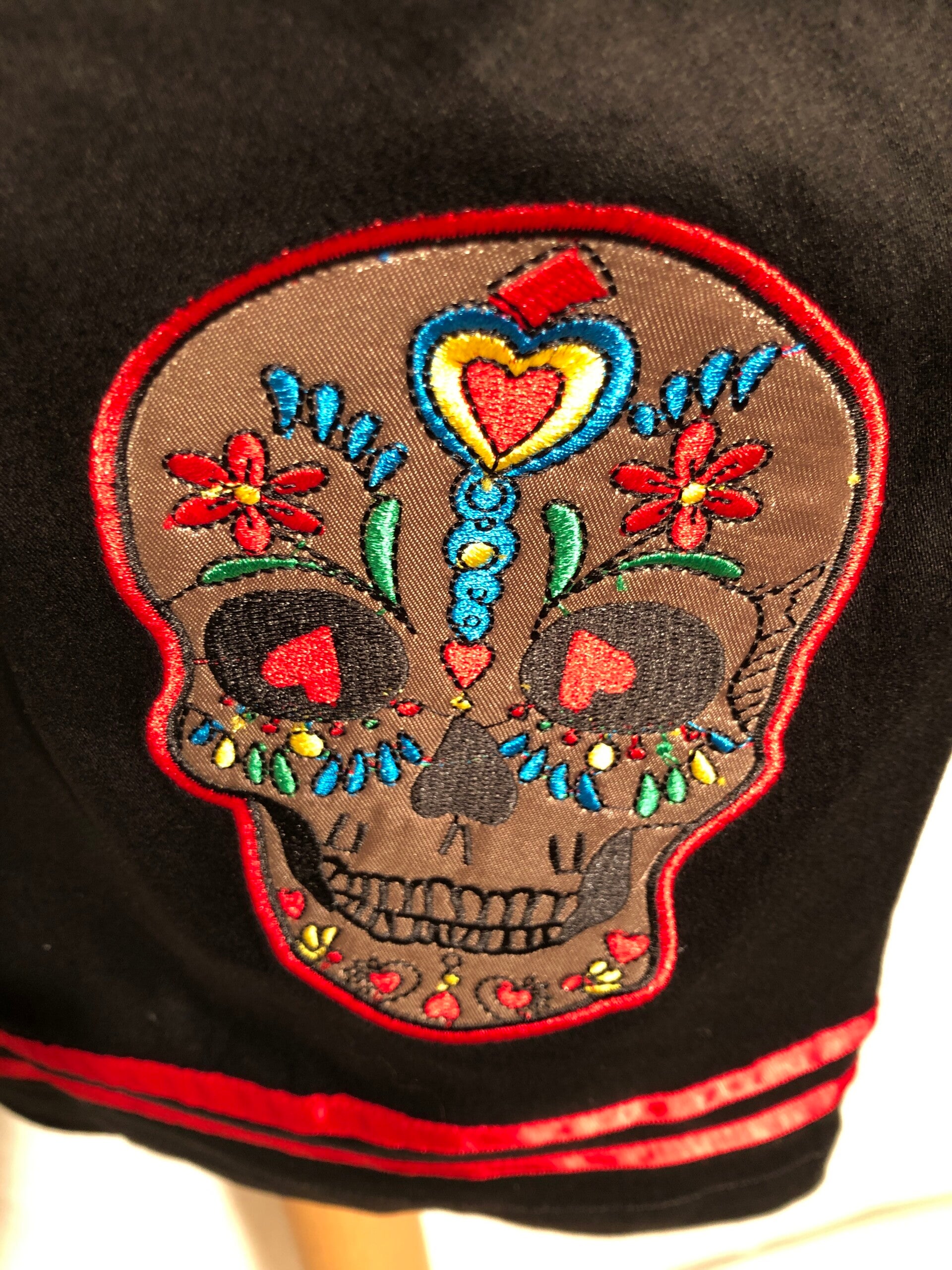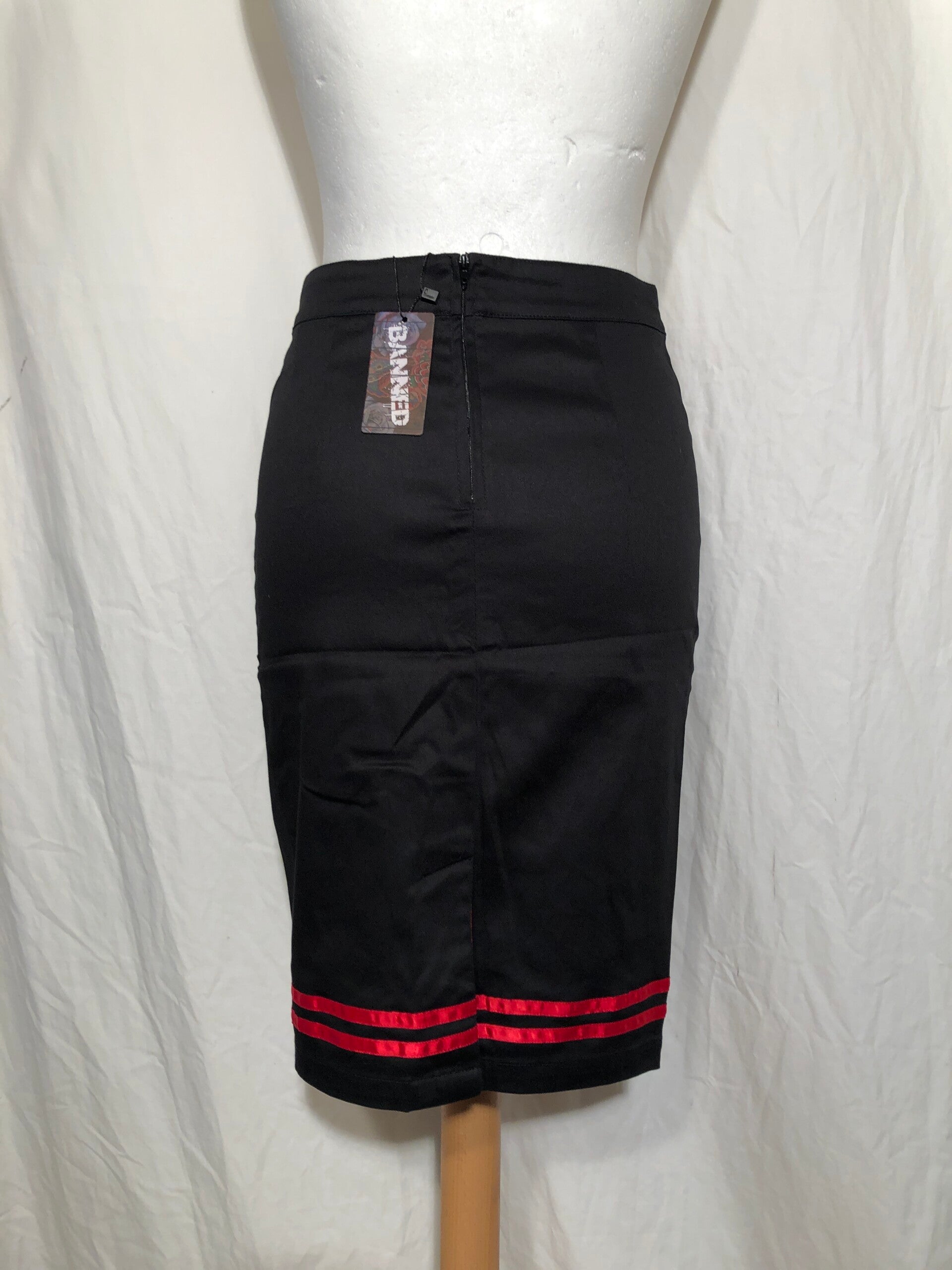 Banned zwart retro kokerrok met skull en rode biesjes maat S