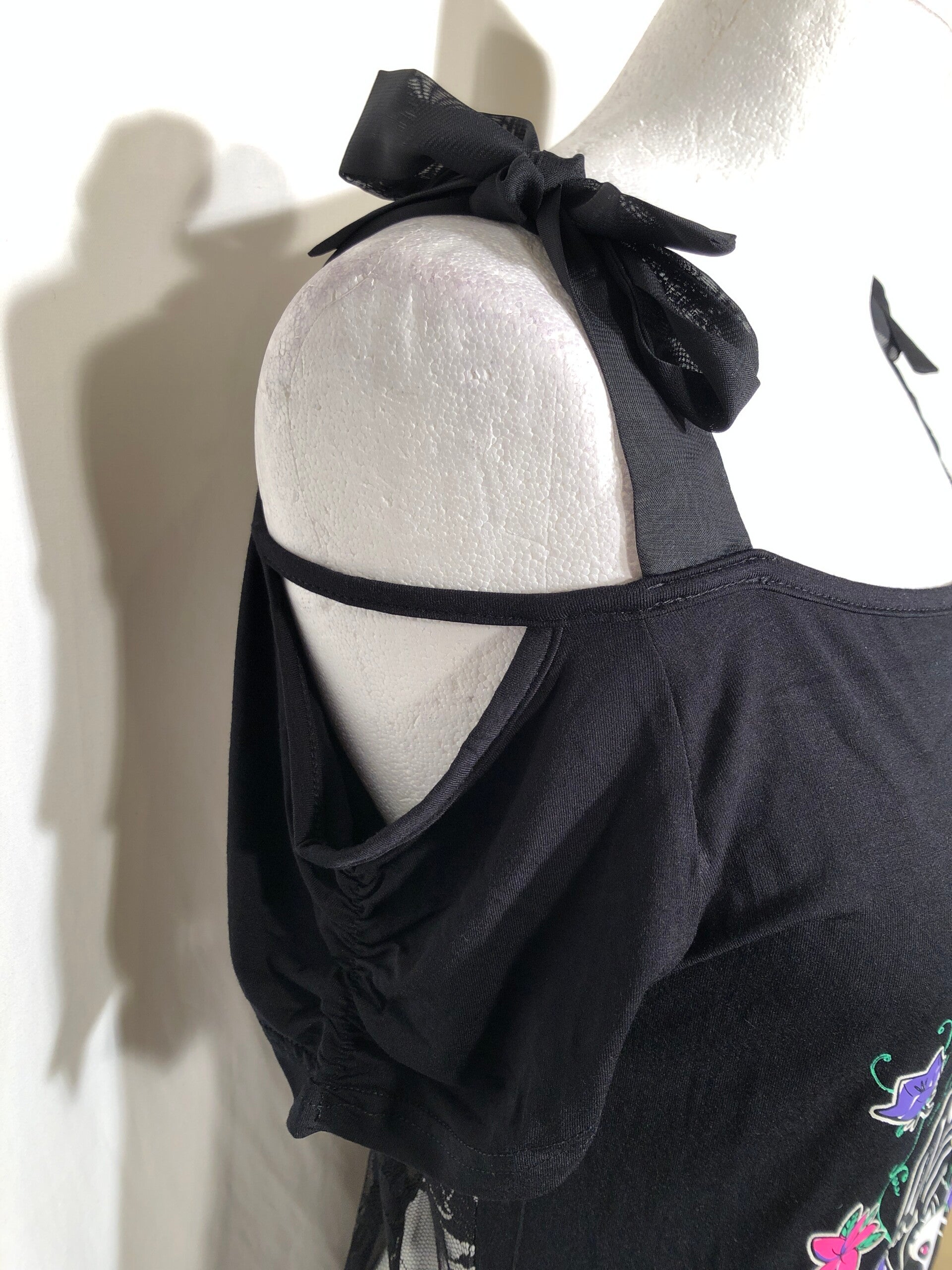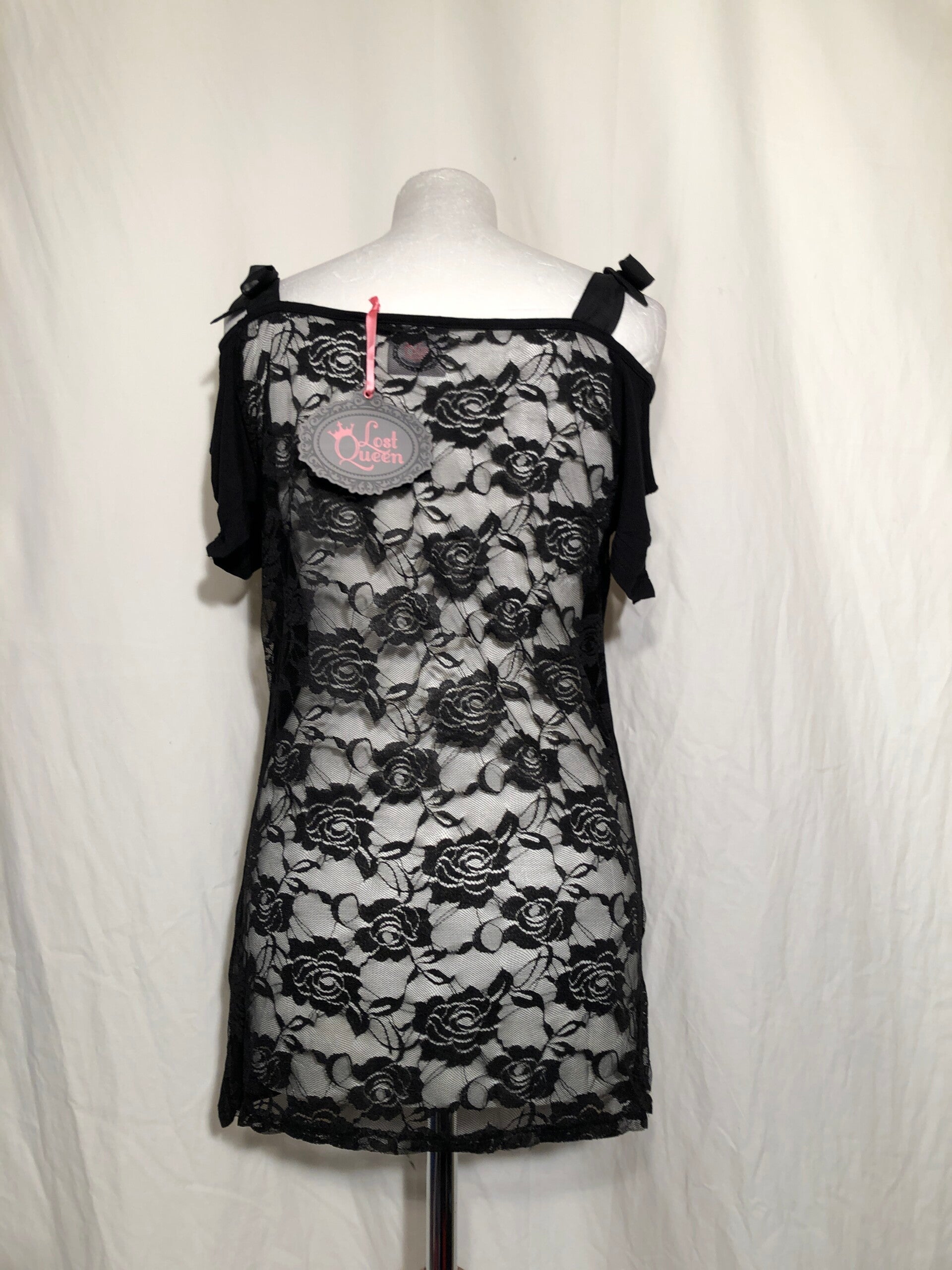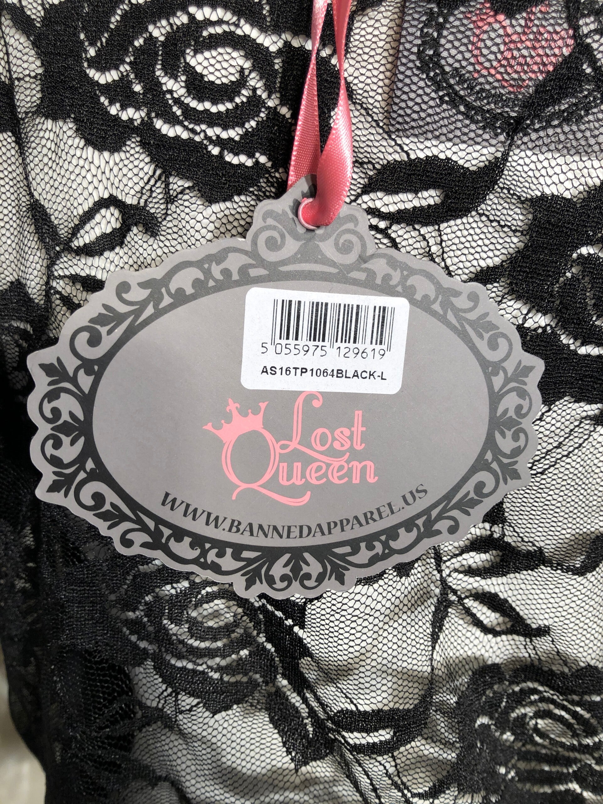 Lost Queen by Banned zwart T-shirt met opdruk L, doorschijnend kanten rugpand korte mouwtjes en (verstelbare) strikjes op de schouders maat L