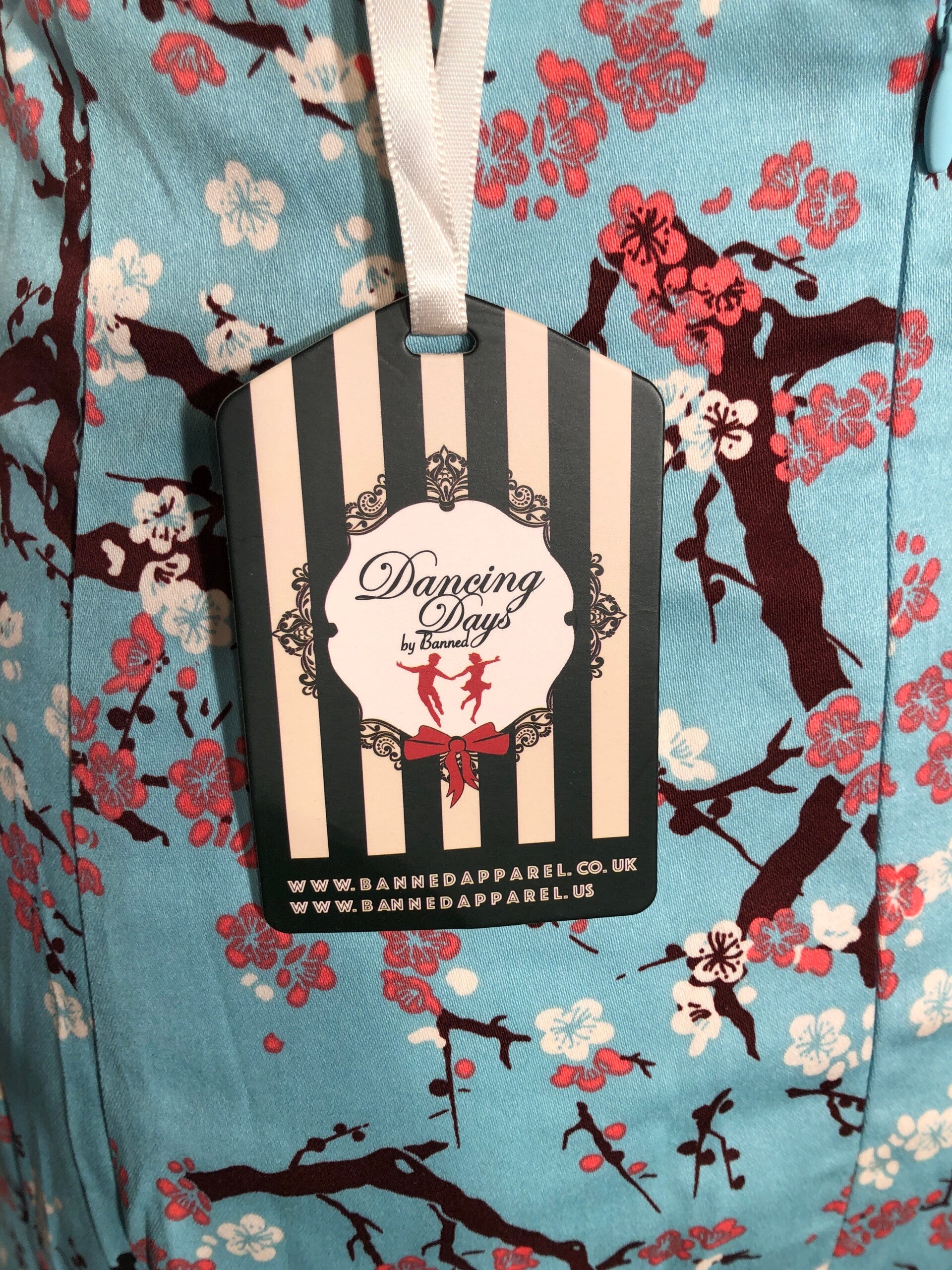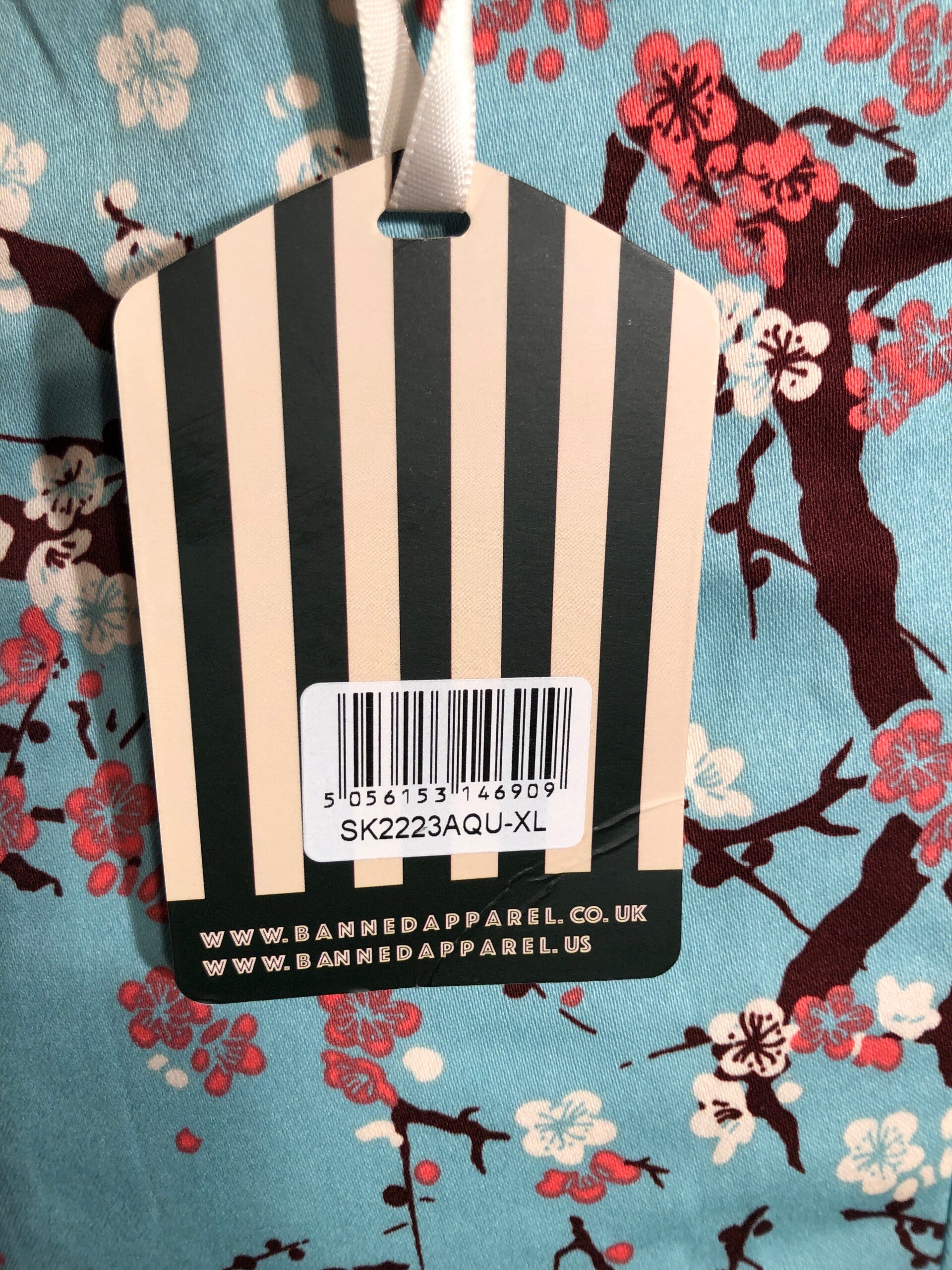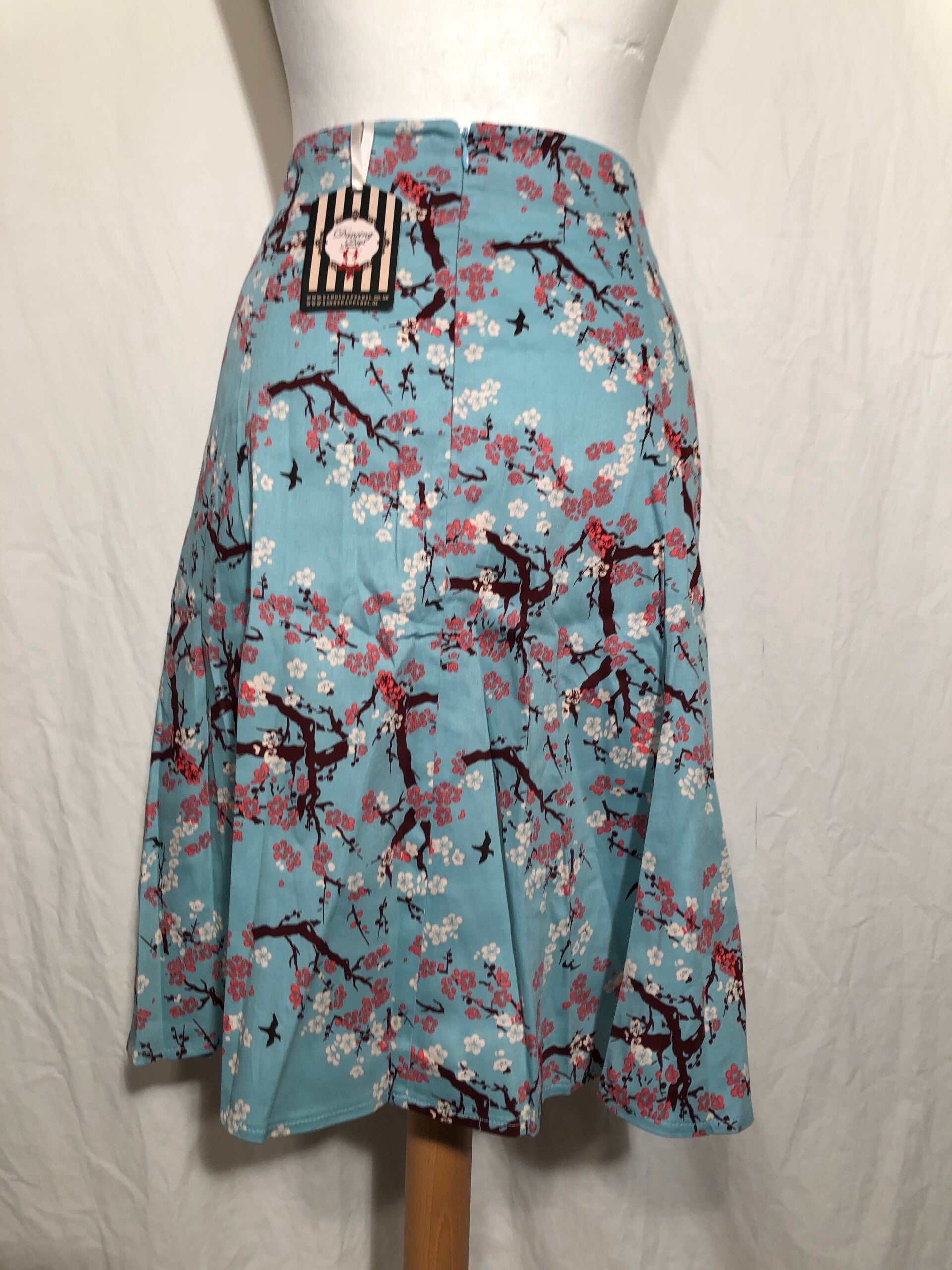 Dancing days by Banned lichtblauwe retro cirkel rok met roze strik op de voorzijde en bloesem takken print maat XL