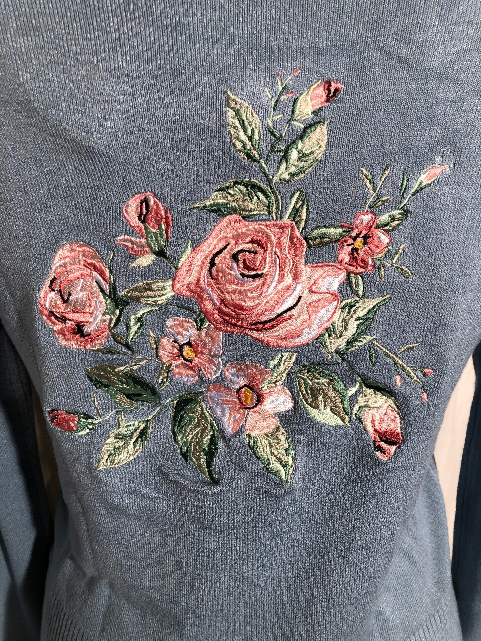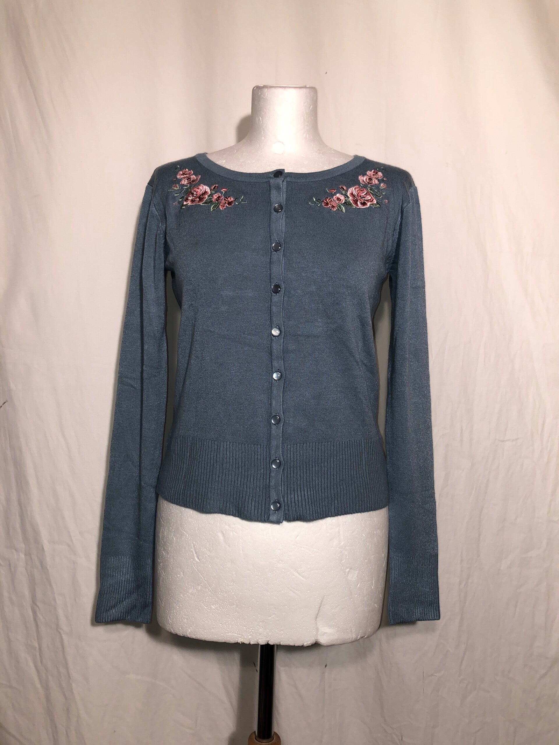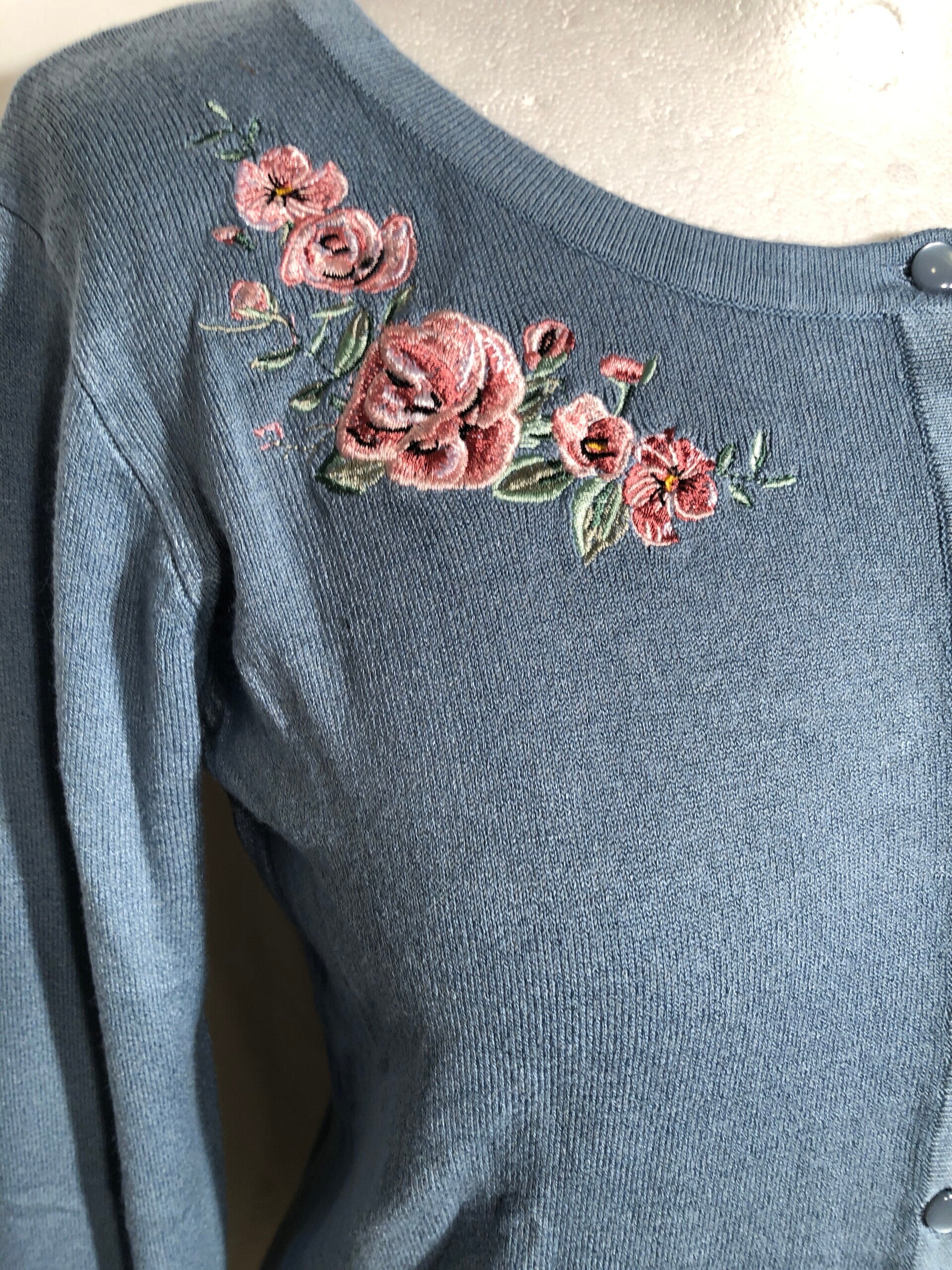 Banned zachtblauw retro vestje met geborduurde rozen op de voor- en achterzijde maat S