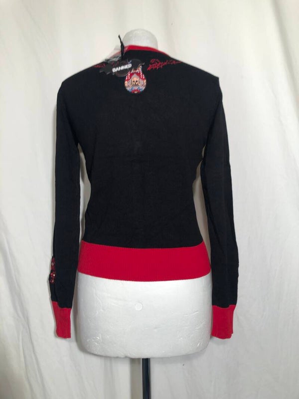 Vanned zwart/rood vestje met borduur en applicaties op de voor- en achterzijde en op de mouwen maat S