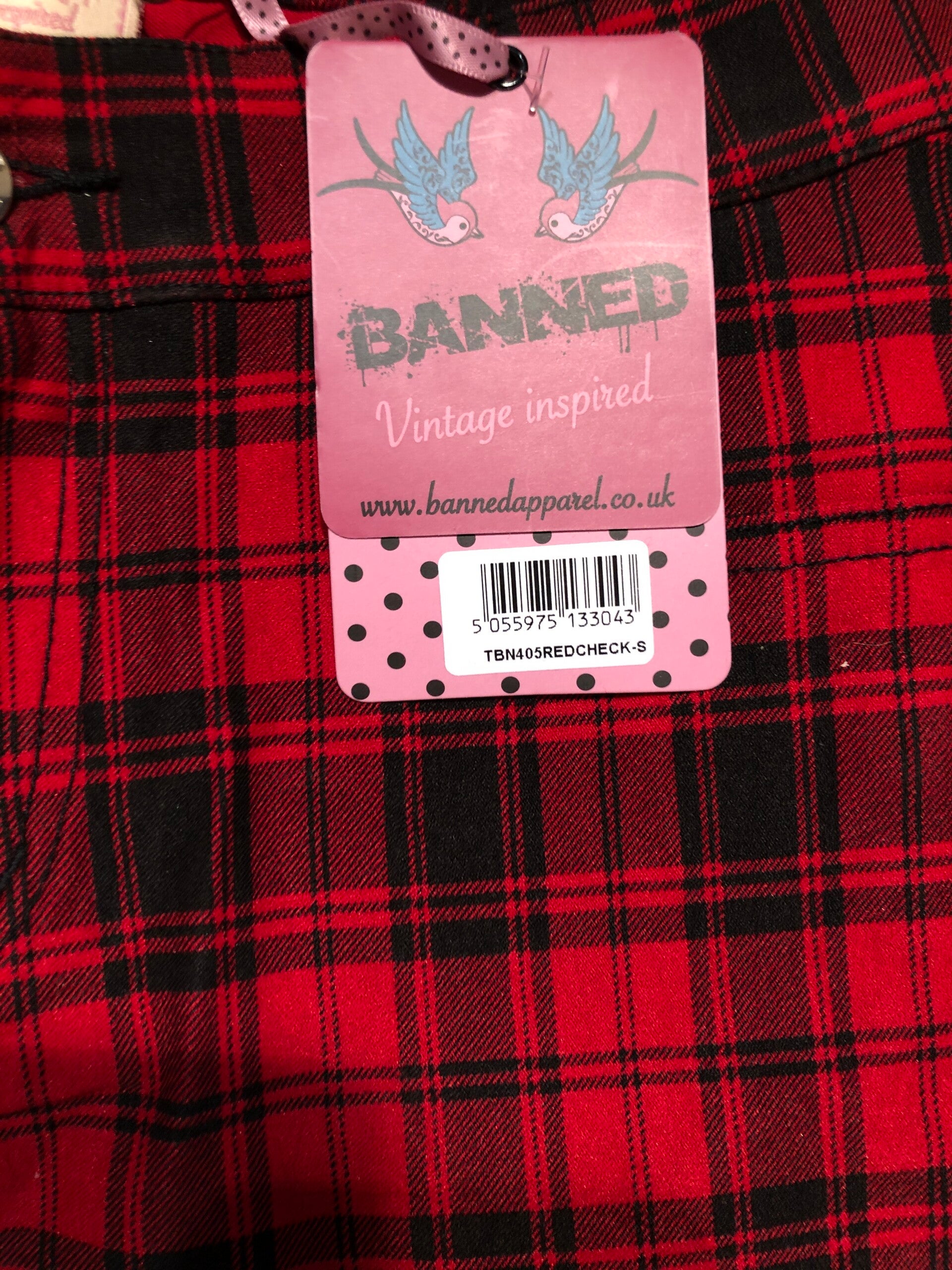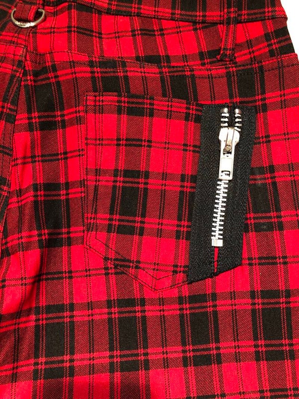 Banned rood/zwart geruite stretchie broek met sierritsjes op de zakken op de achterzijde maat S