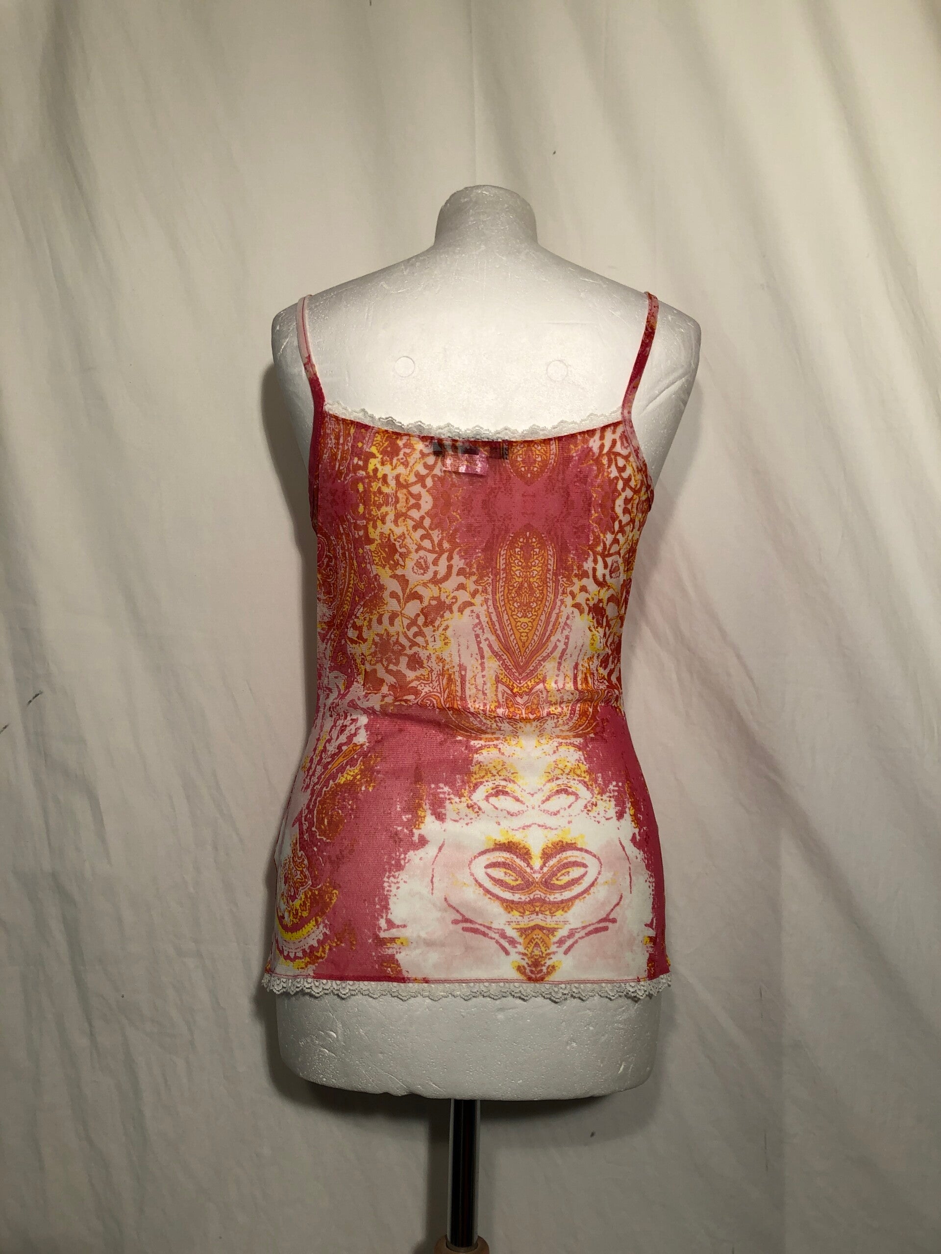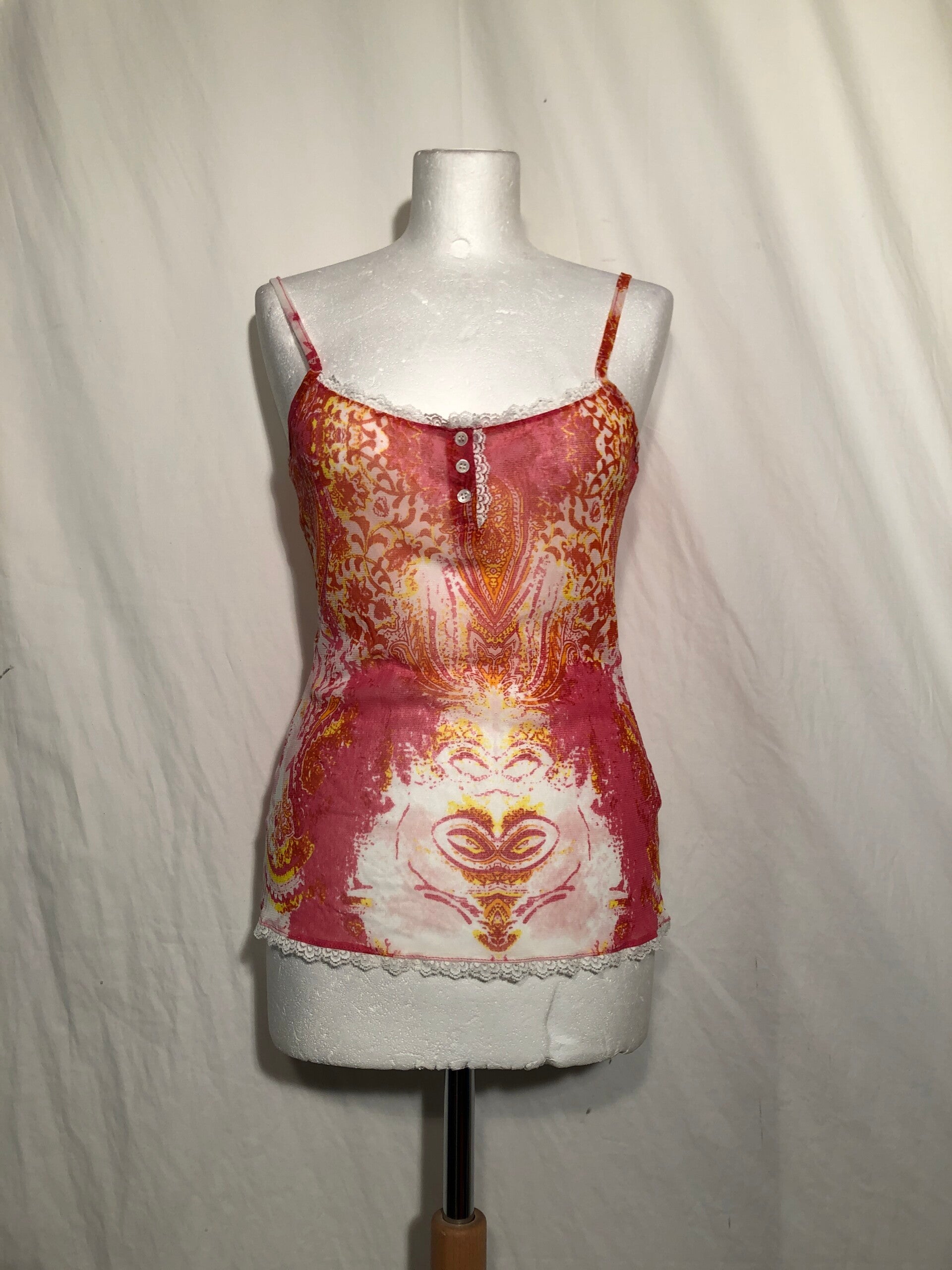 Josephine & Co roze/oranje/geel print doorschijnend hemdje met knoopjes op de buste en kanten biesjes maat S
