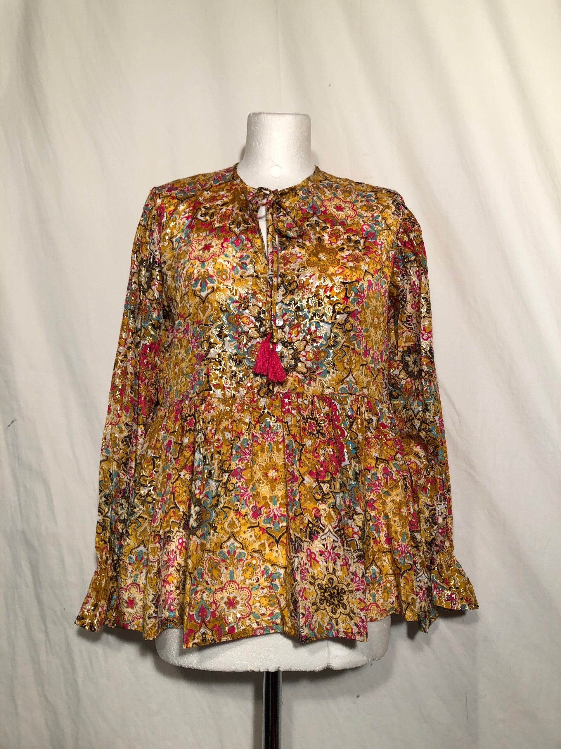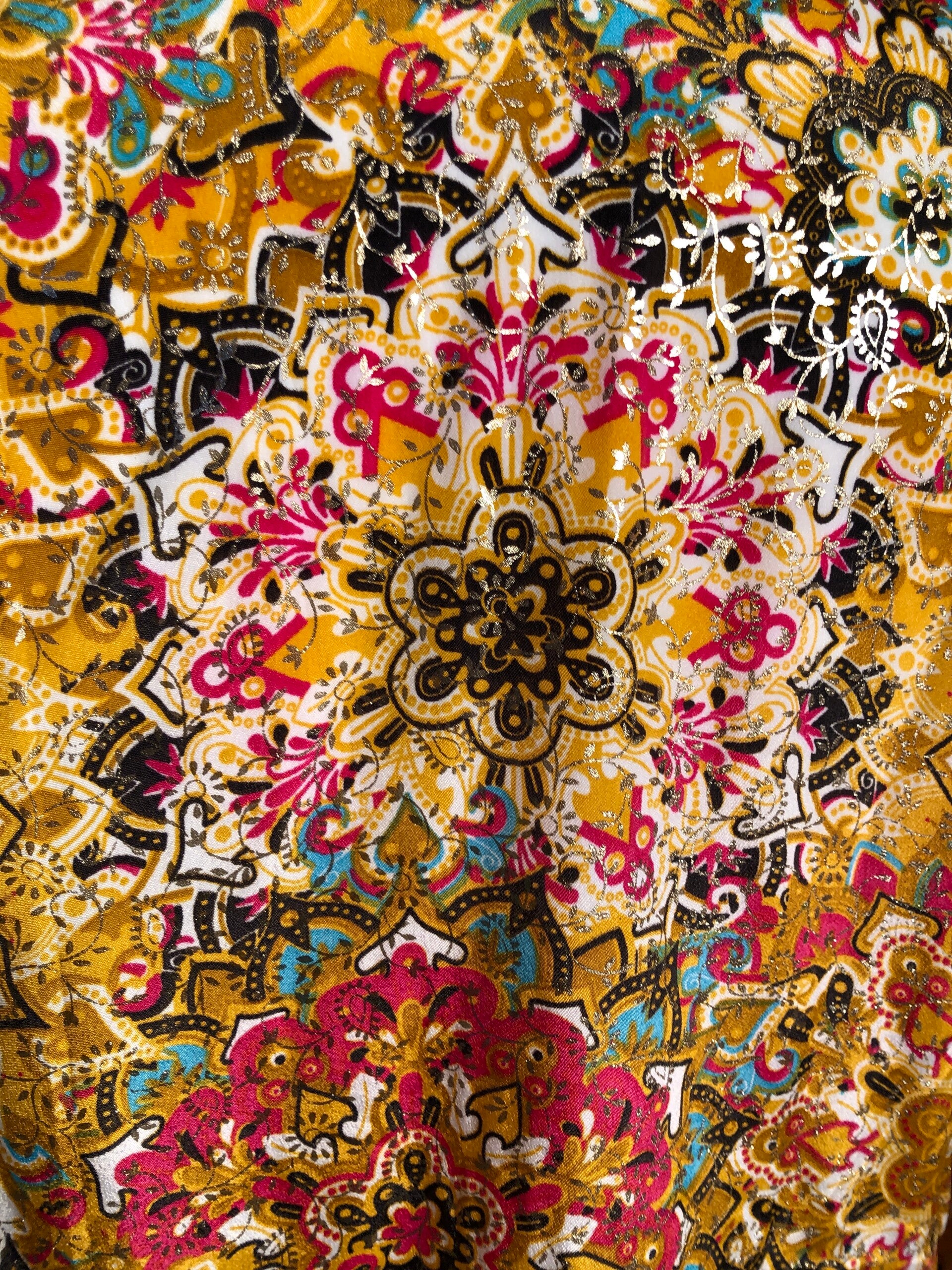 Purple Queen okergeel meerkleurig tuniek met goudopdruk maat M