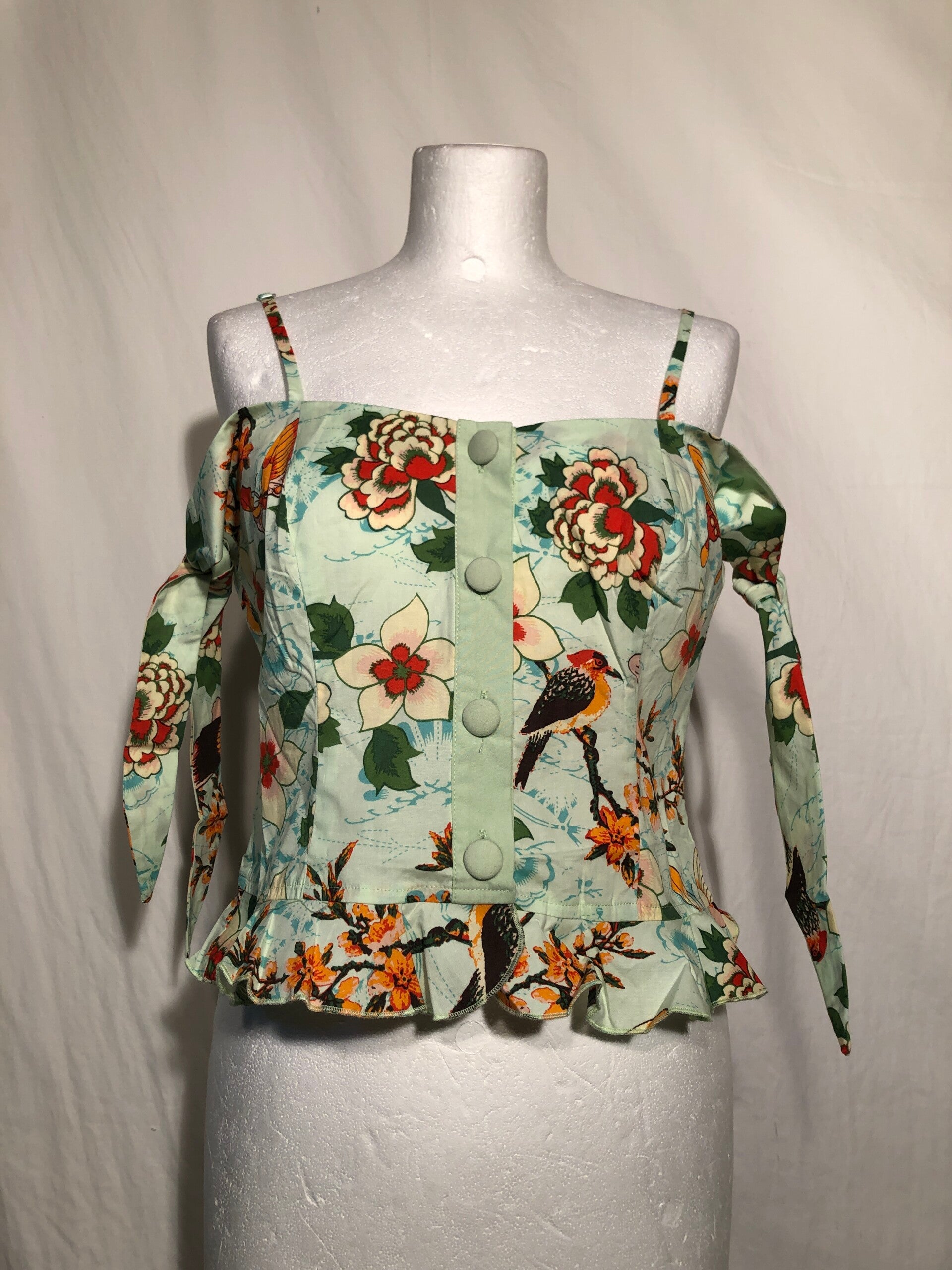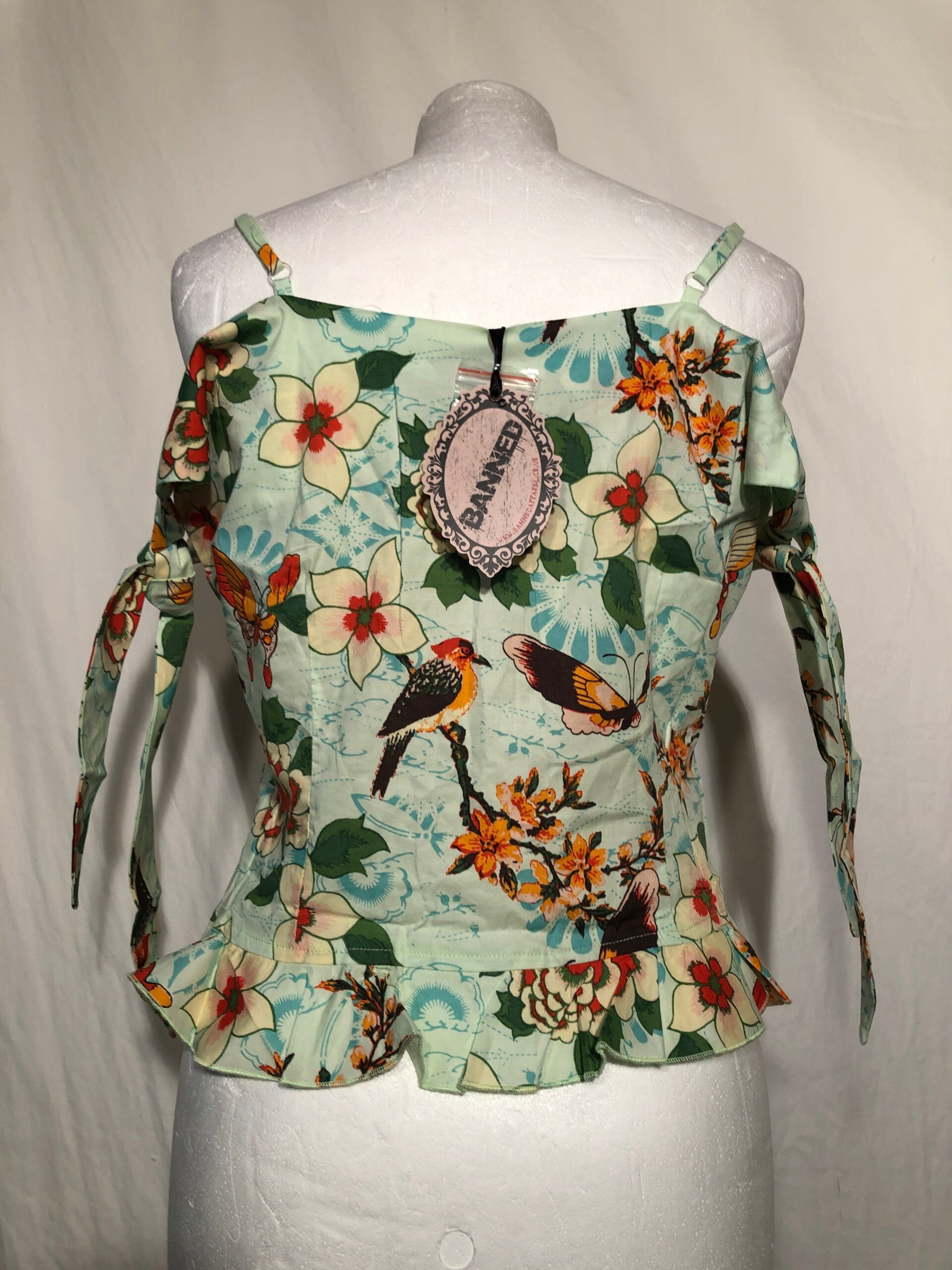 Banned lichtgroen retro top met bloemen en vogels en strikjes op de bovenarm maat M