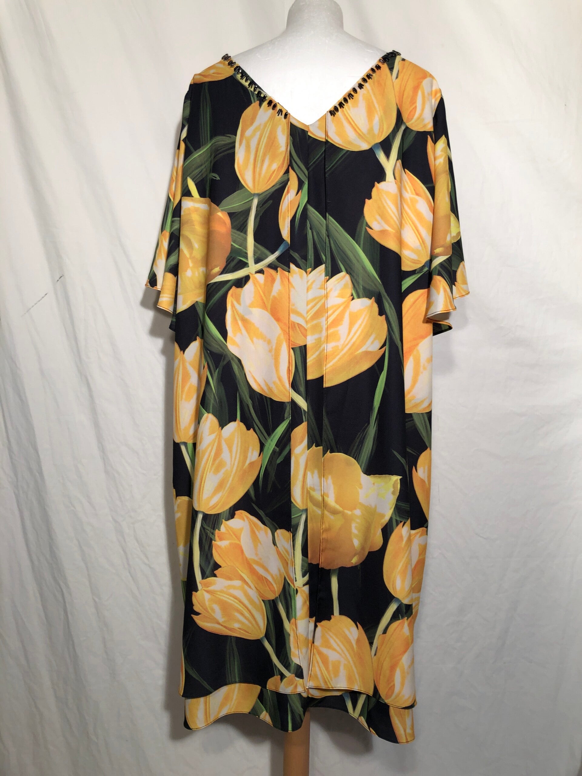 Yoek zwarte jurk met gele tulpen print, studs en kraaltjes langs de kraag en detail op de achterzijde 50/52