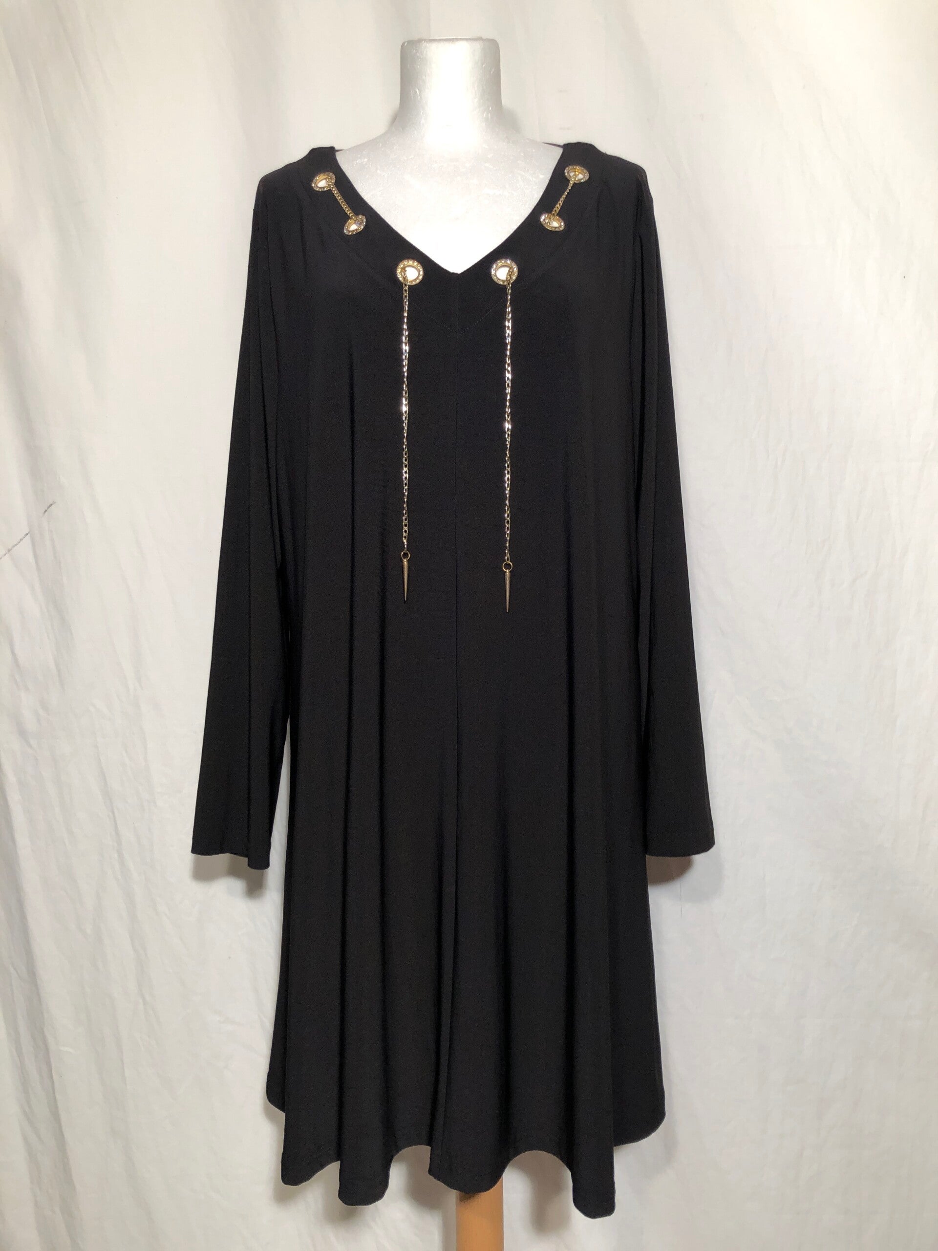 Yoek Black label zwart tuniek met glitter rondjes en kettinkjes op de voorzijde en lange mouwen maat 50/52