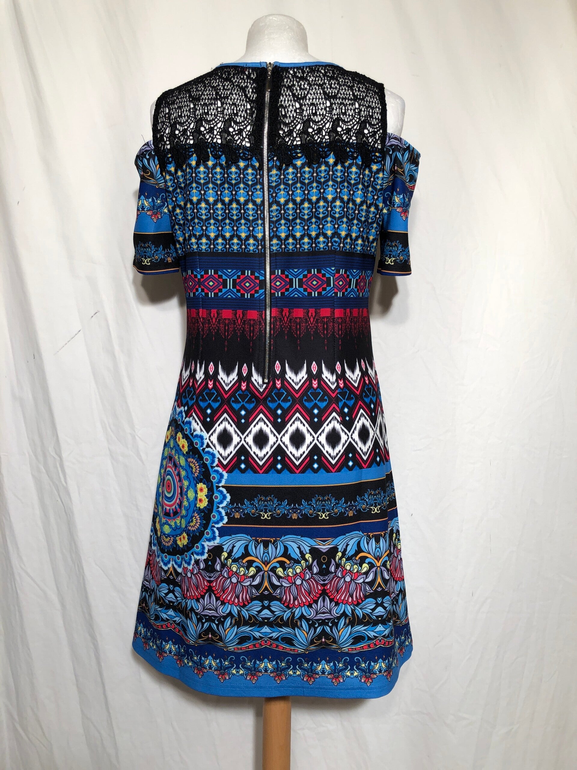 101Idees meerkleurige print jurk met open schouders en kant maat M/L