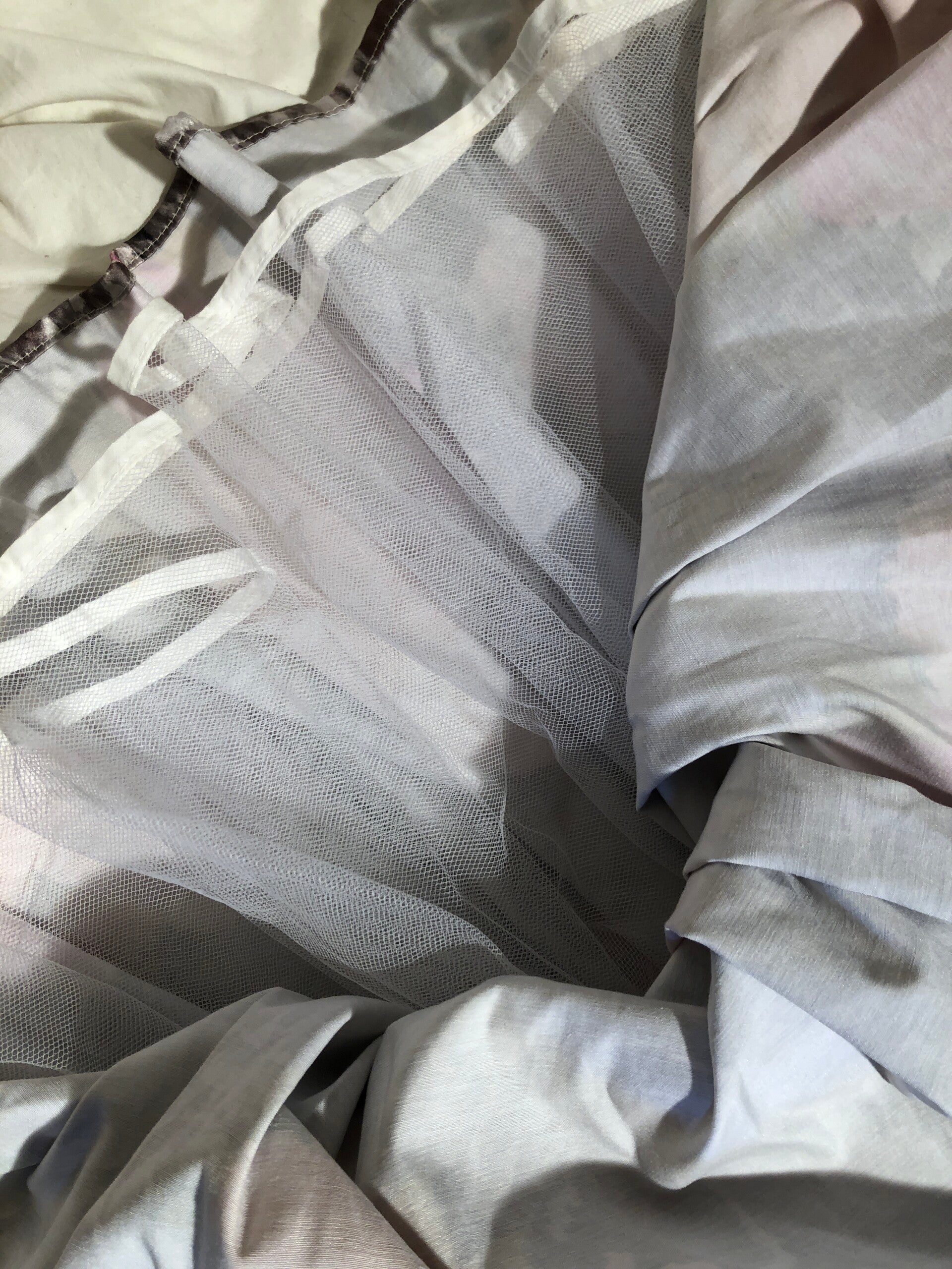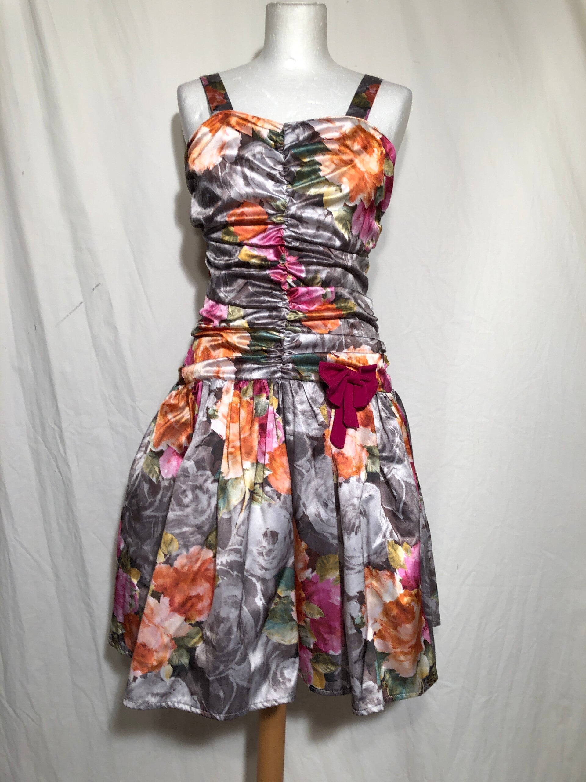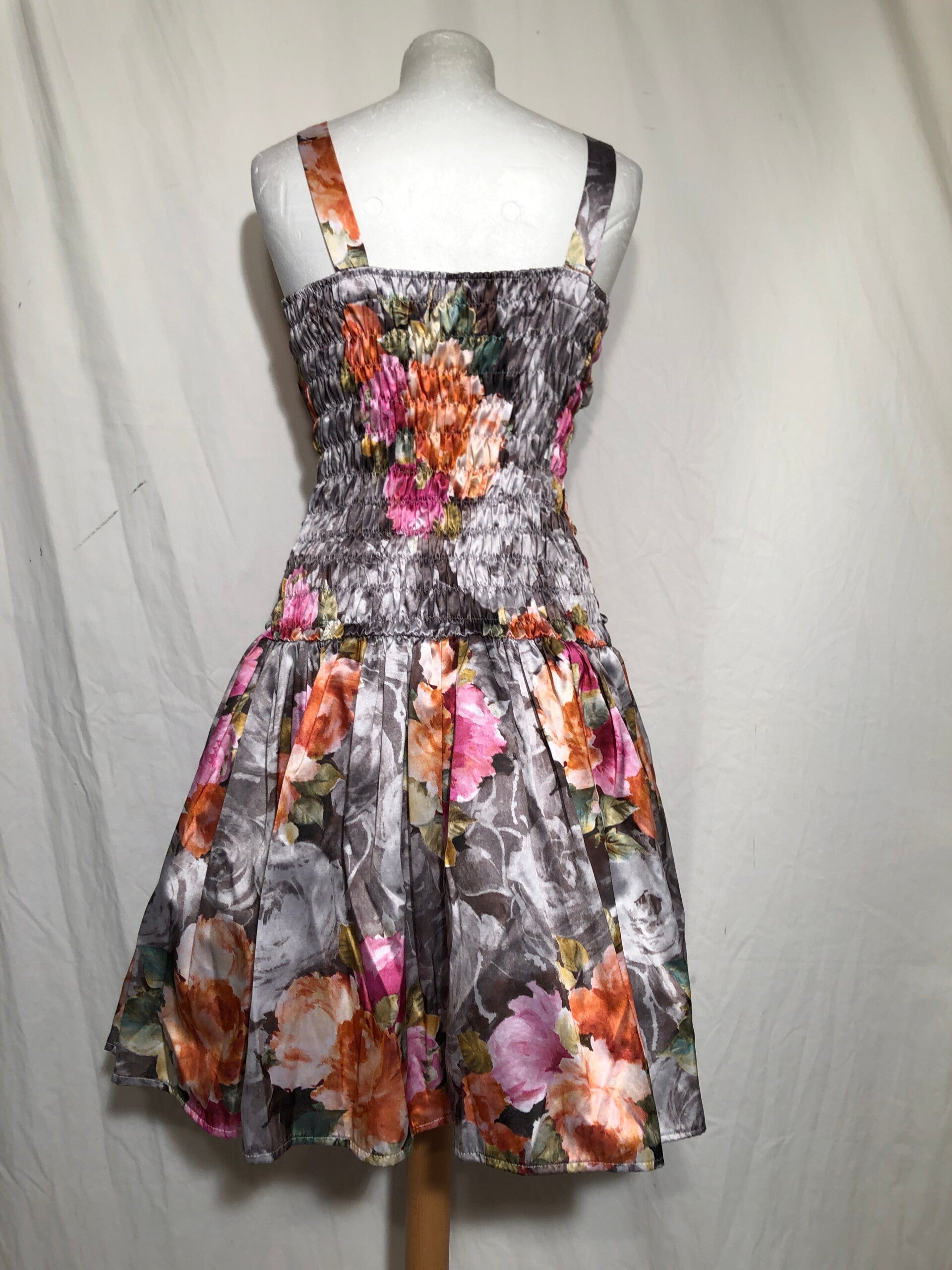 Chantal Rosner by Cartoon grijs gebloemde cocktail jurk met roze strik op de zij en vaste petticoat maat M