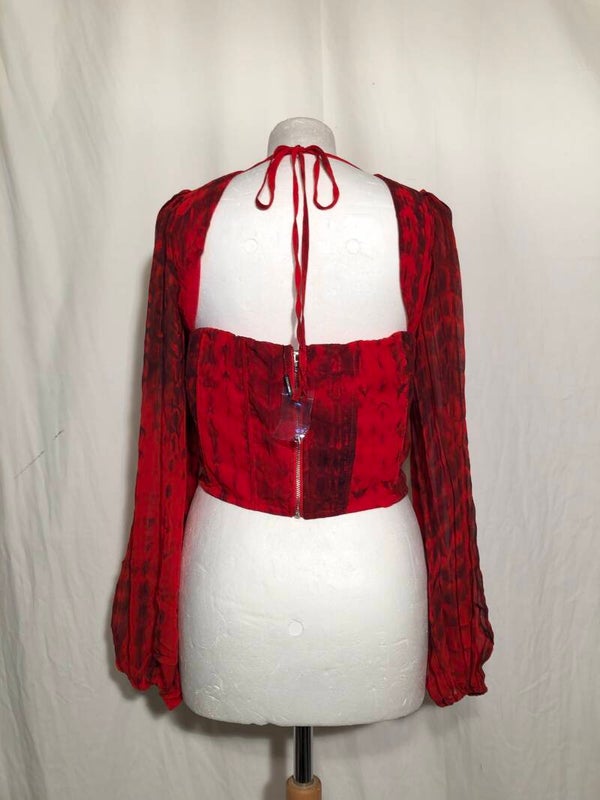 FashionNova rood/zwarte bustier top met strikjes en sierknoopjes op de voorzijde, wijde mouwen, rits op de rug en strik tussen de schouders maat XL