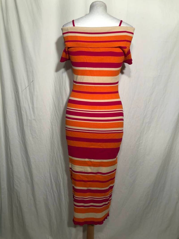 FashionNova oranje/roze/beige horizontaal gestreepte jurk met korte mouwtjes, spaghetti bandjes en band rond de schouders maat XL
