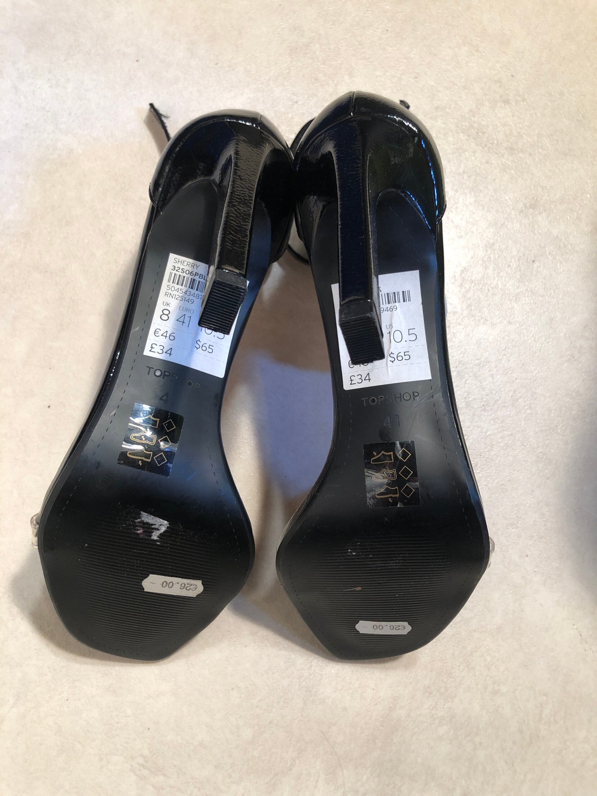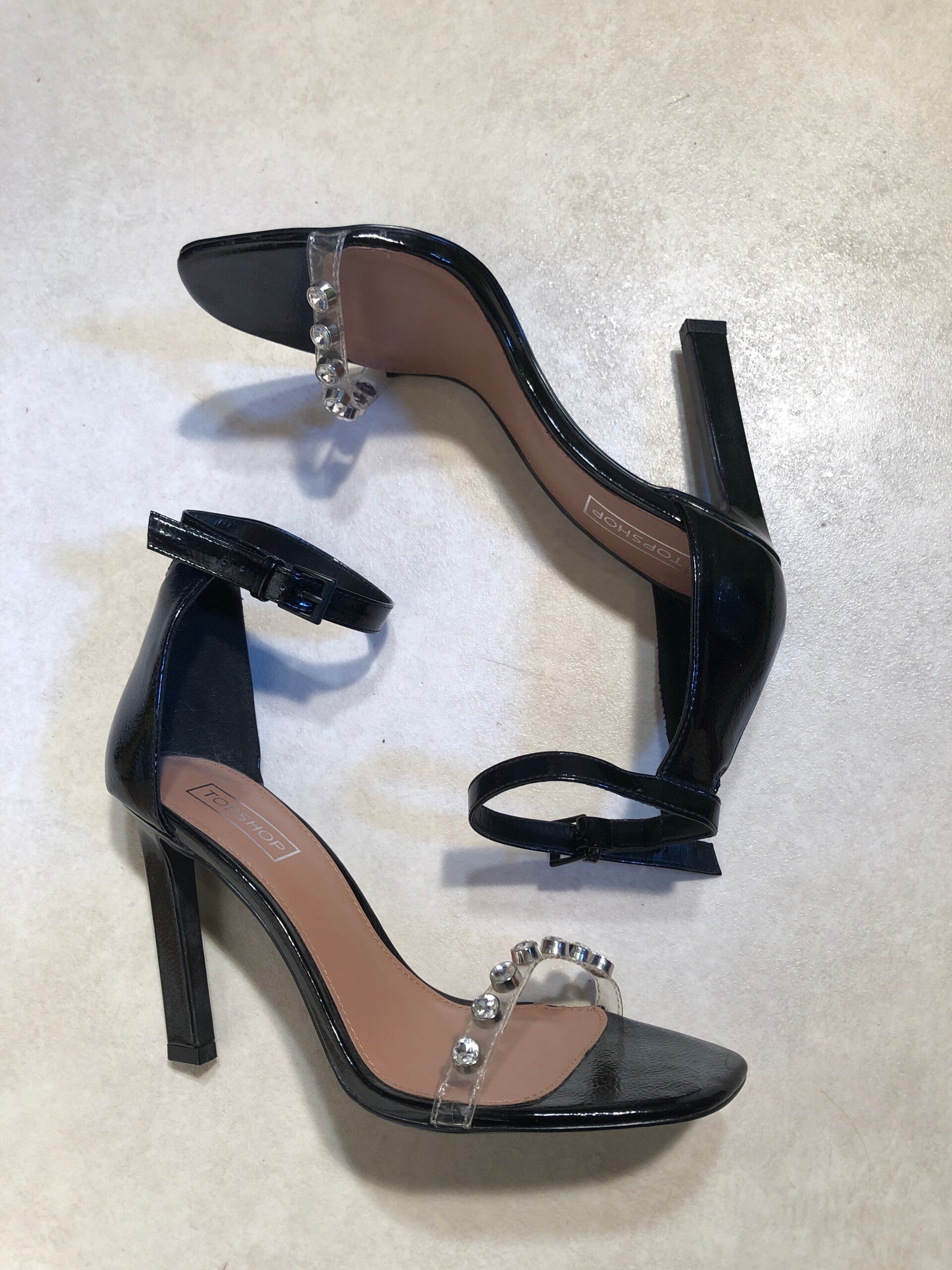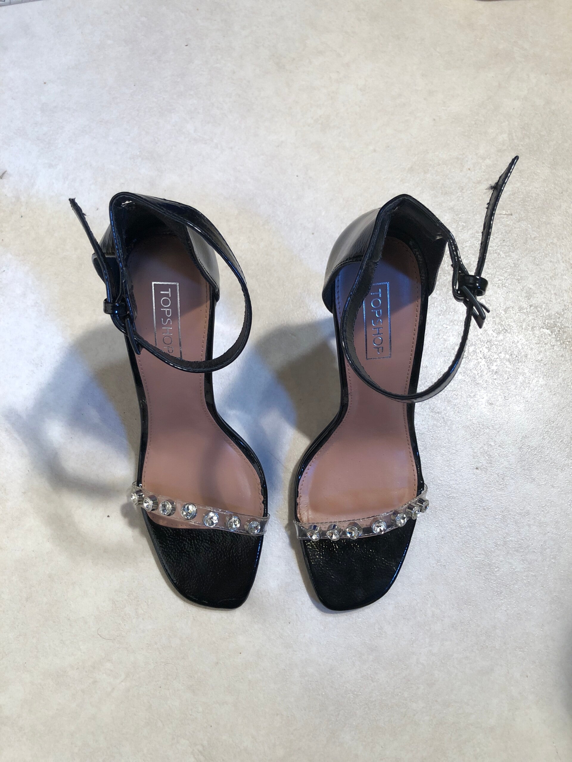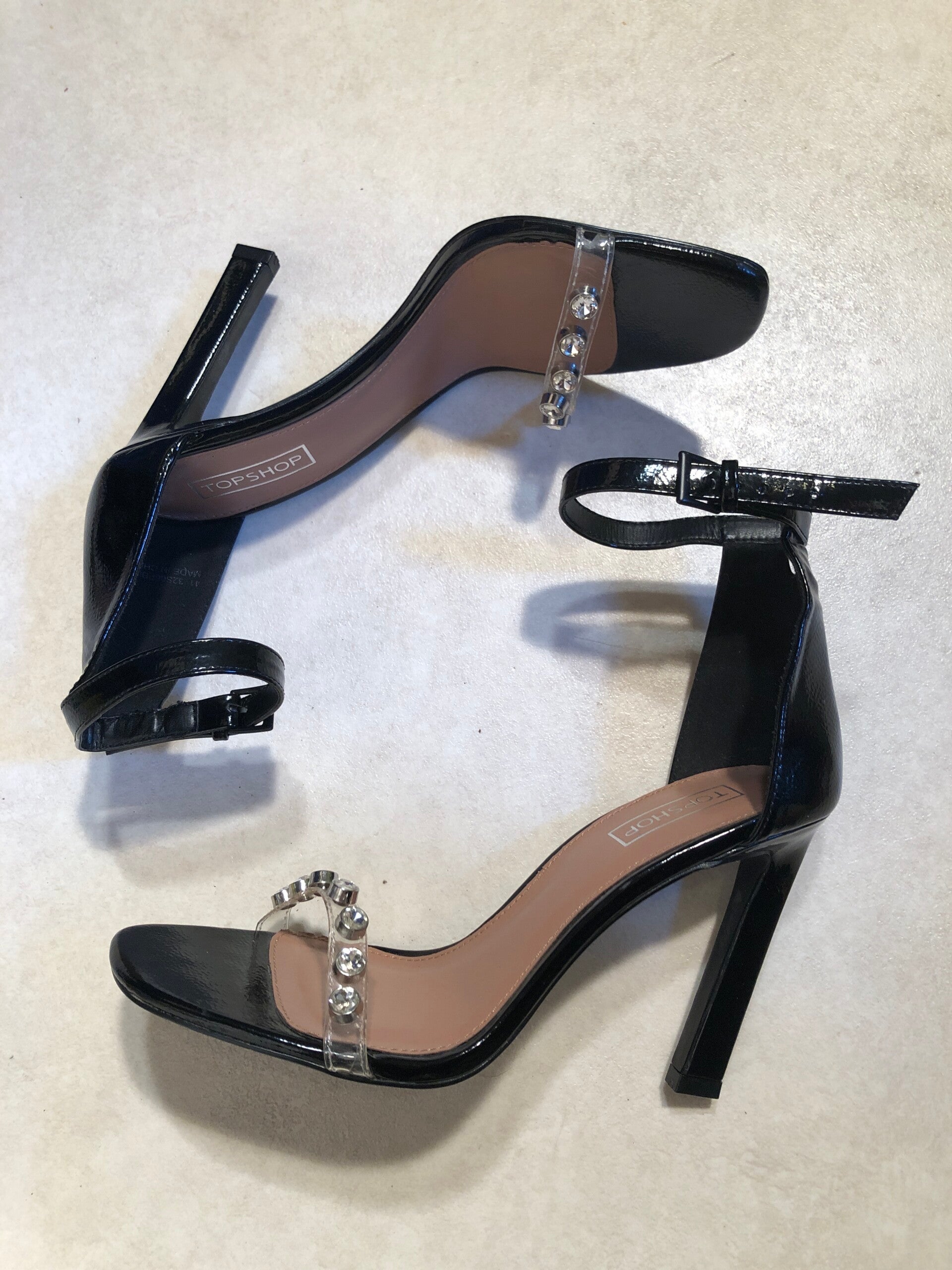 Top Shop zwarte lak peeptoe pumps met glittersteentjes op het bandje op de tenen en verstelbare gespjes als sluiting rond de enkels maat 41