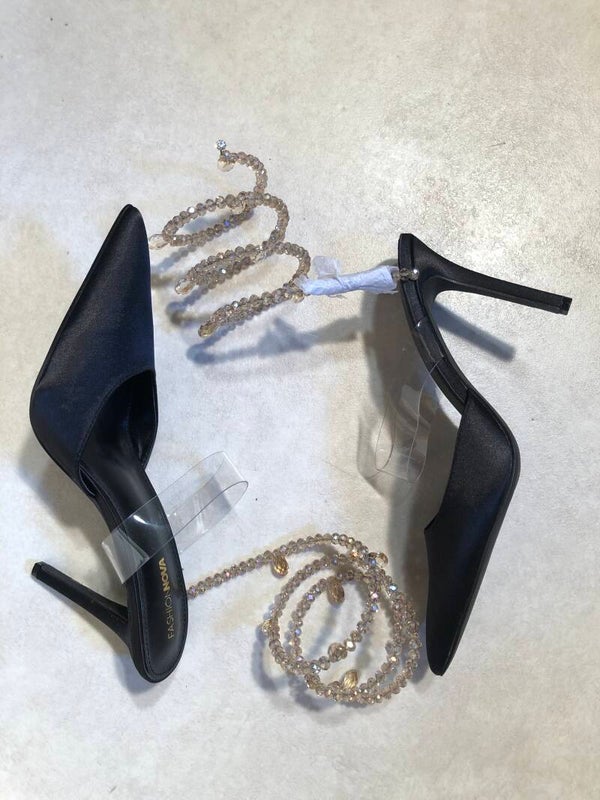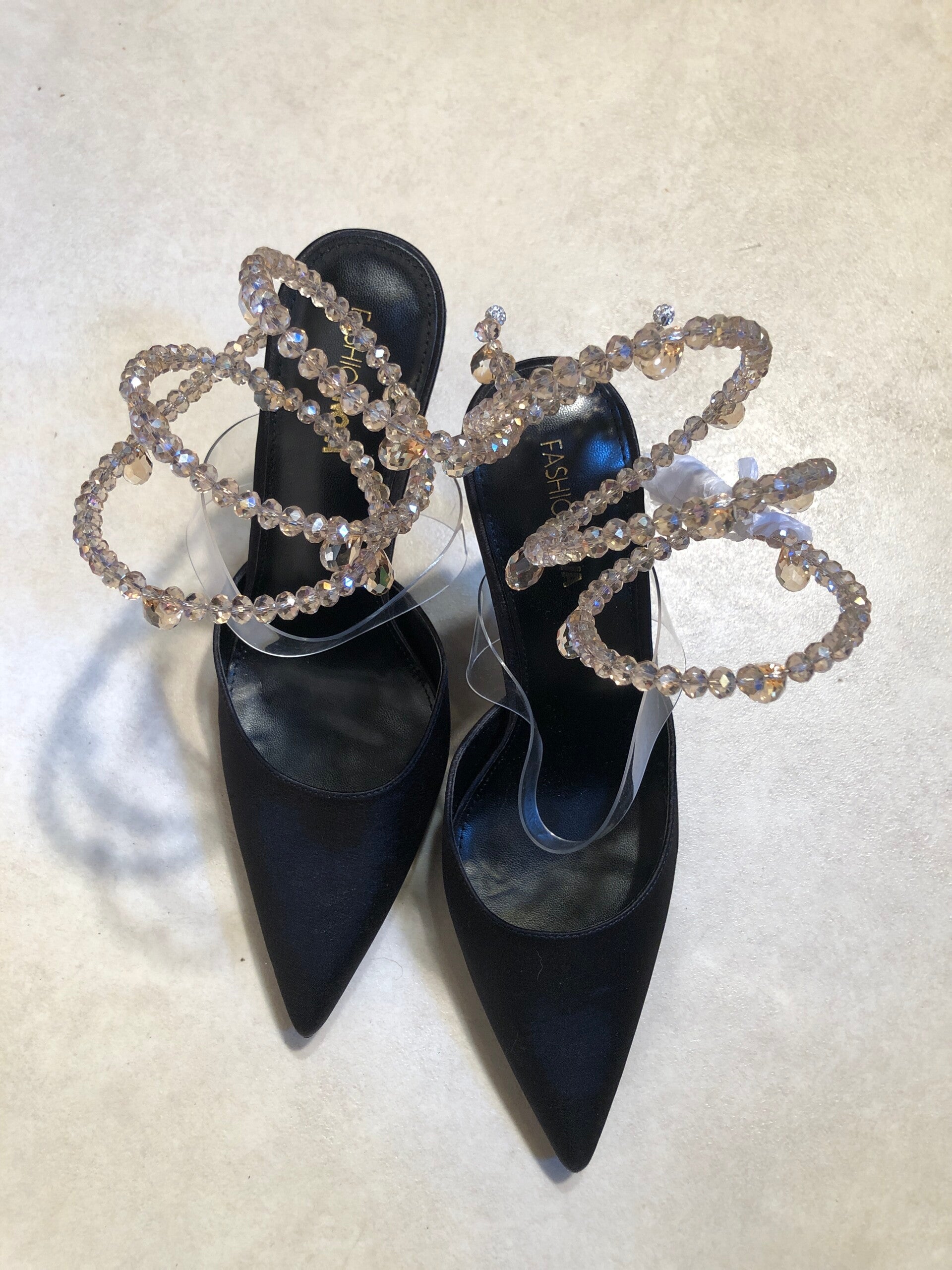 FashionNova zwarte punt pumps met doorzichtige band over de wreef en kralen band rond het onderbeen maat 41