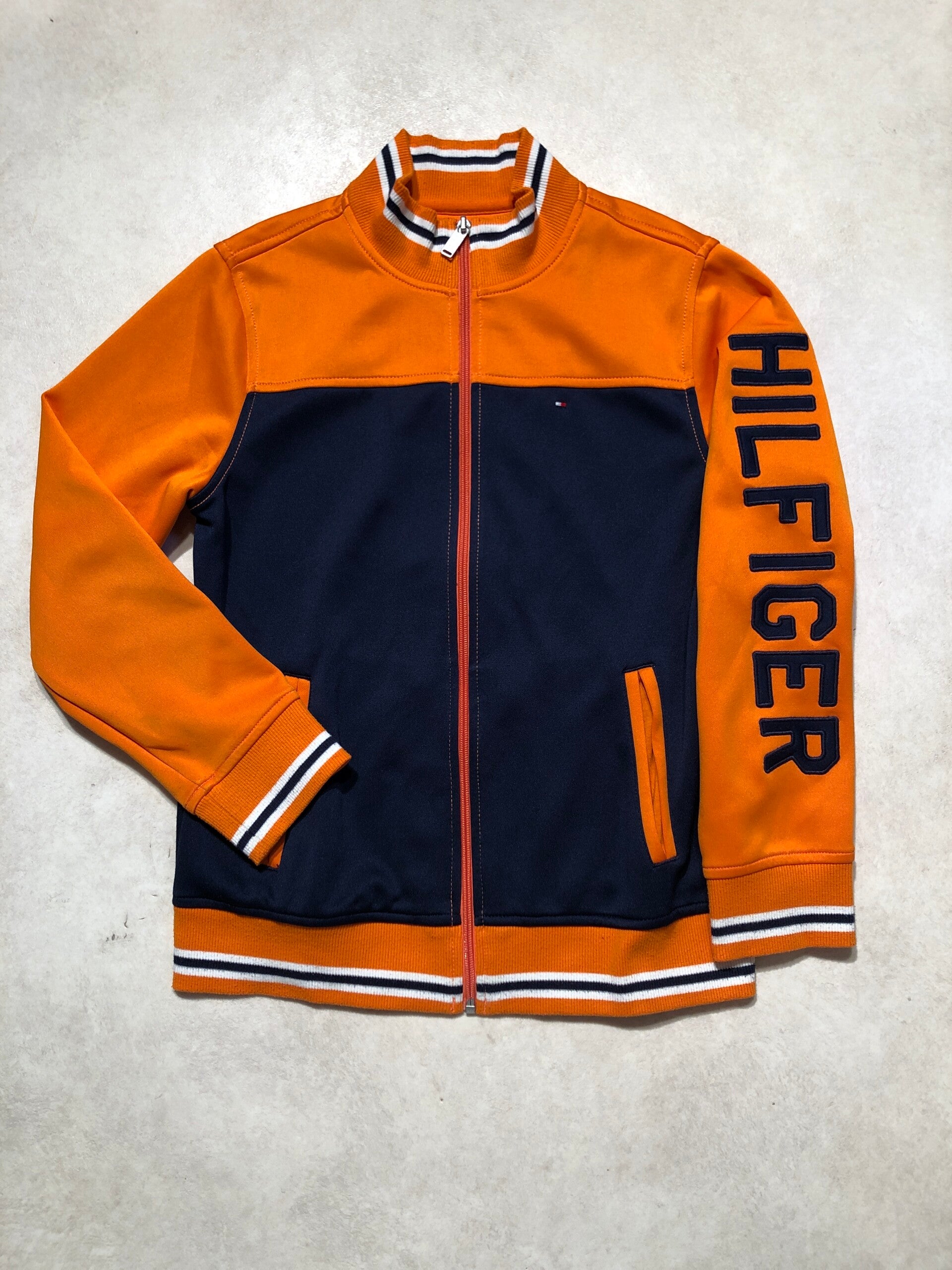 Tommy Hilfiger donkerblauw/oranje sweatjasje met zakken op de voorzijde maat 152/164