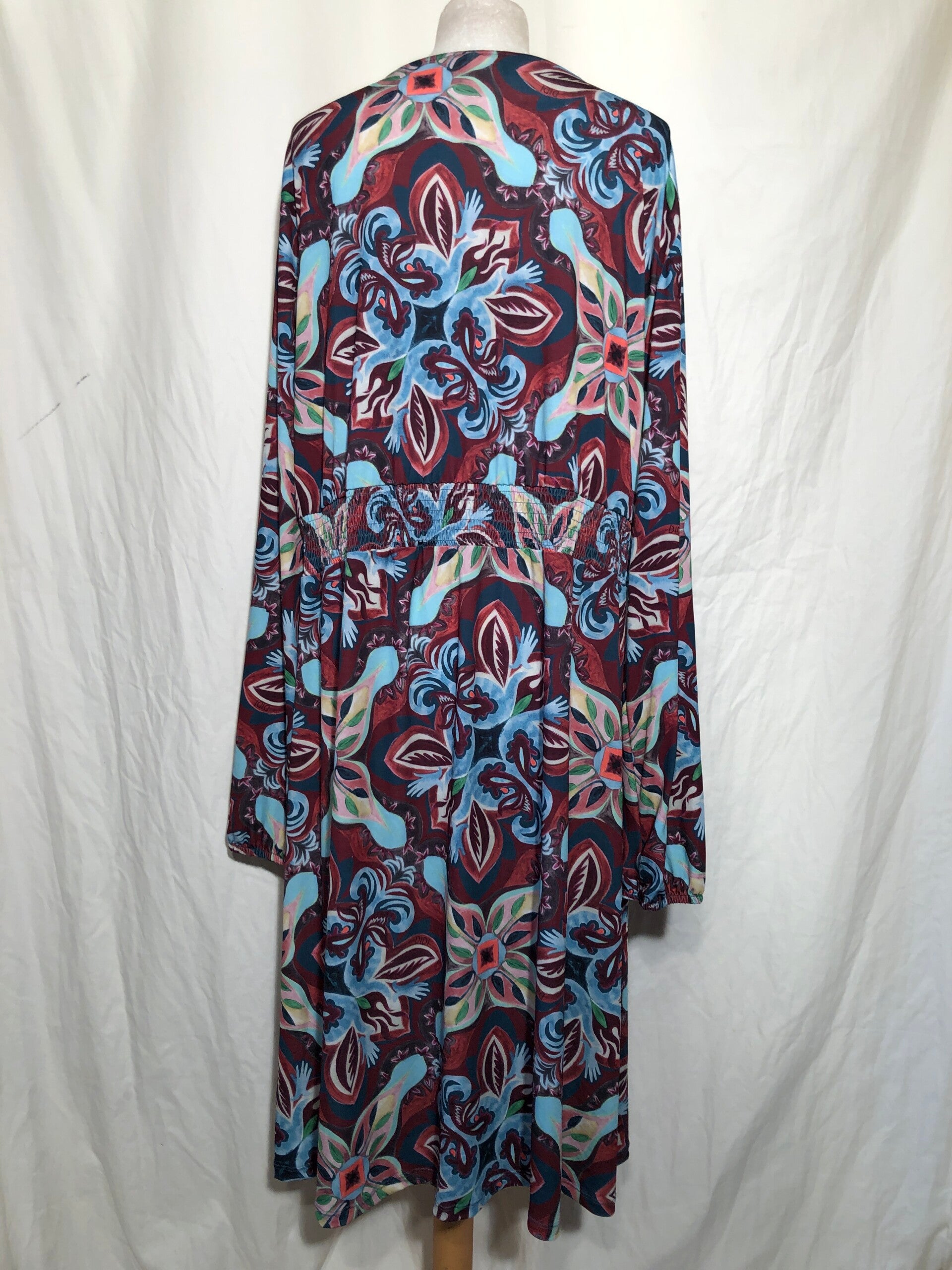 Didi Bordeaux/meerkleurige print jurk met knoopjes op de voorzijde, strik in de taille en elastische band op de rug maat 48