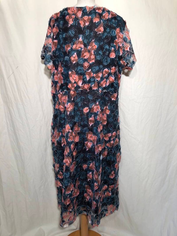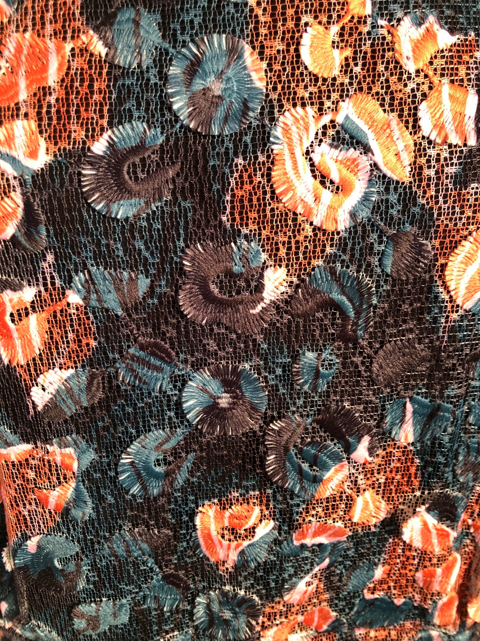 Didi dubbellaags zwarte jurk met oranje/groene applicaties en ronde hals maat 48