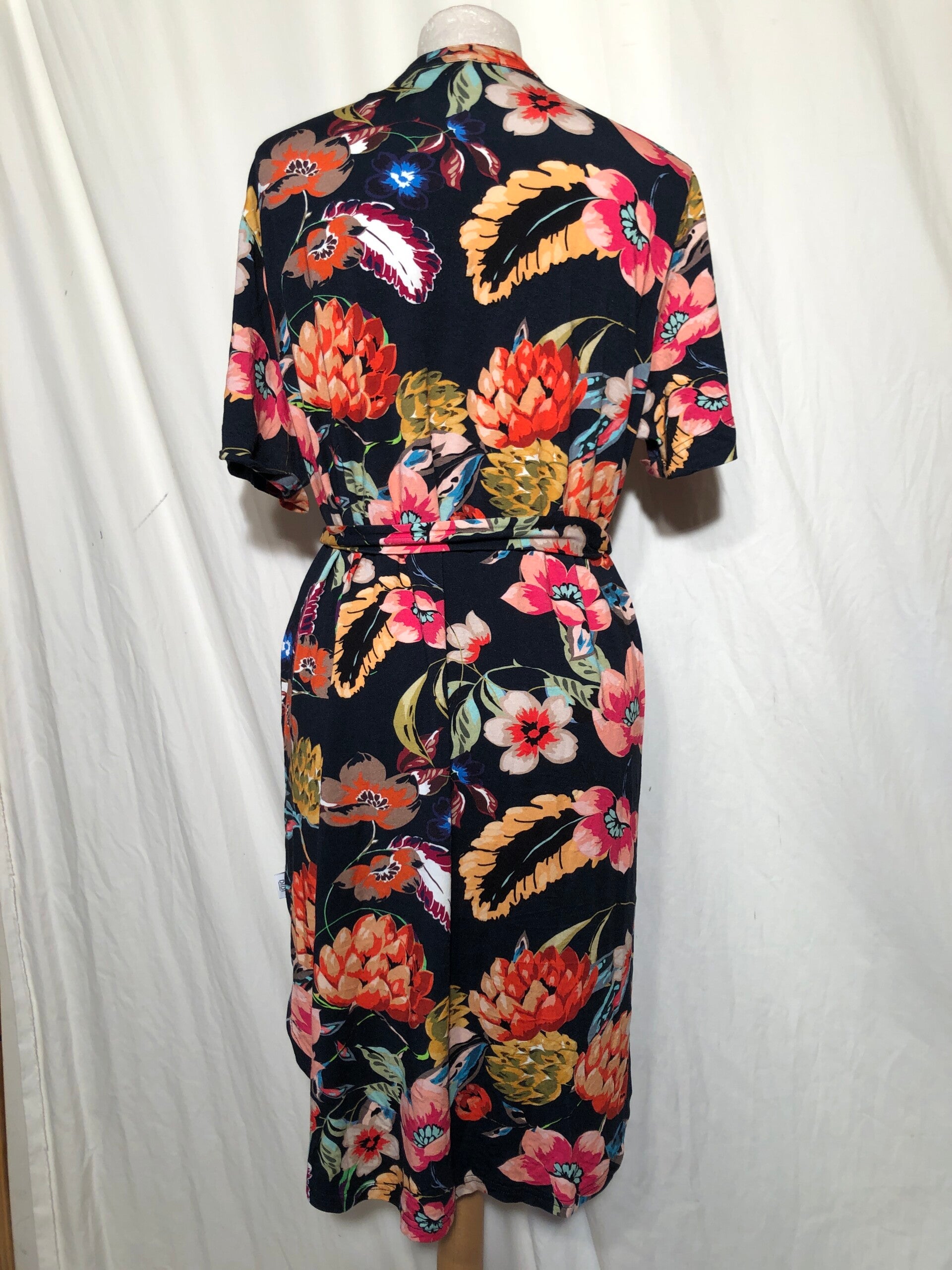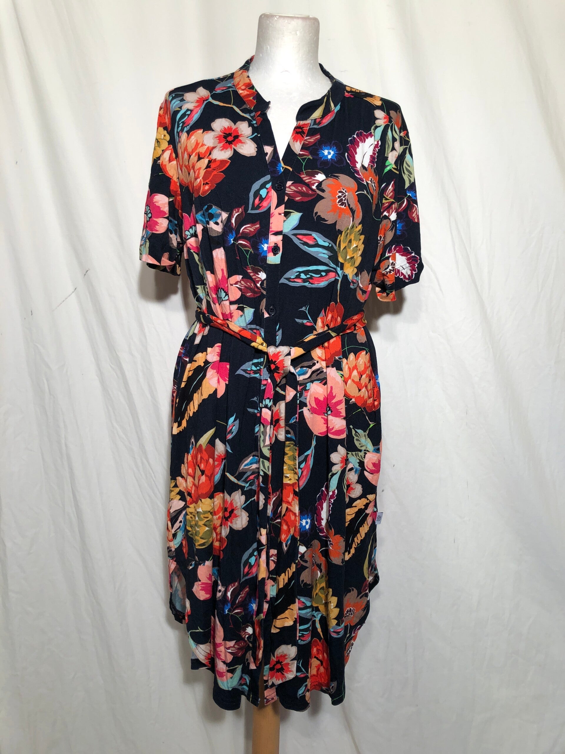 Didi diep donkerblauwe gebloemde jurk met knoopjes op de voorzijde en strikceintuur maat 46