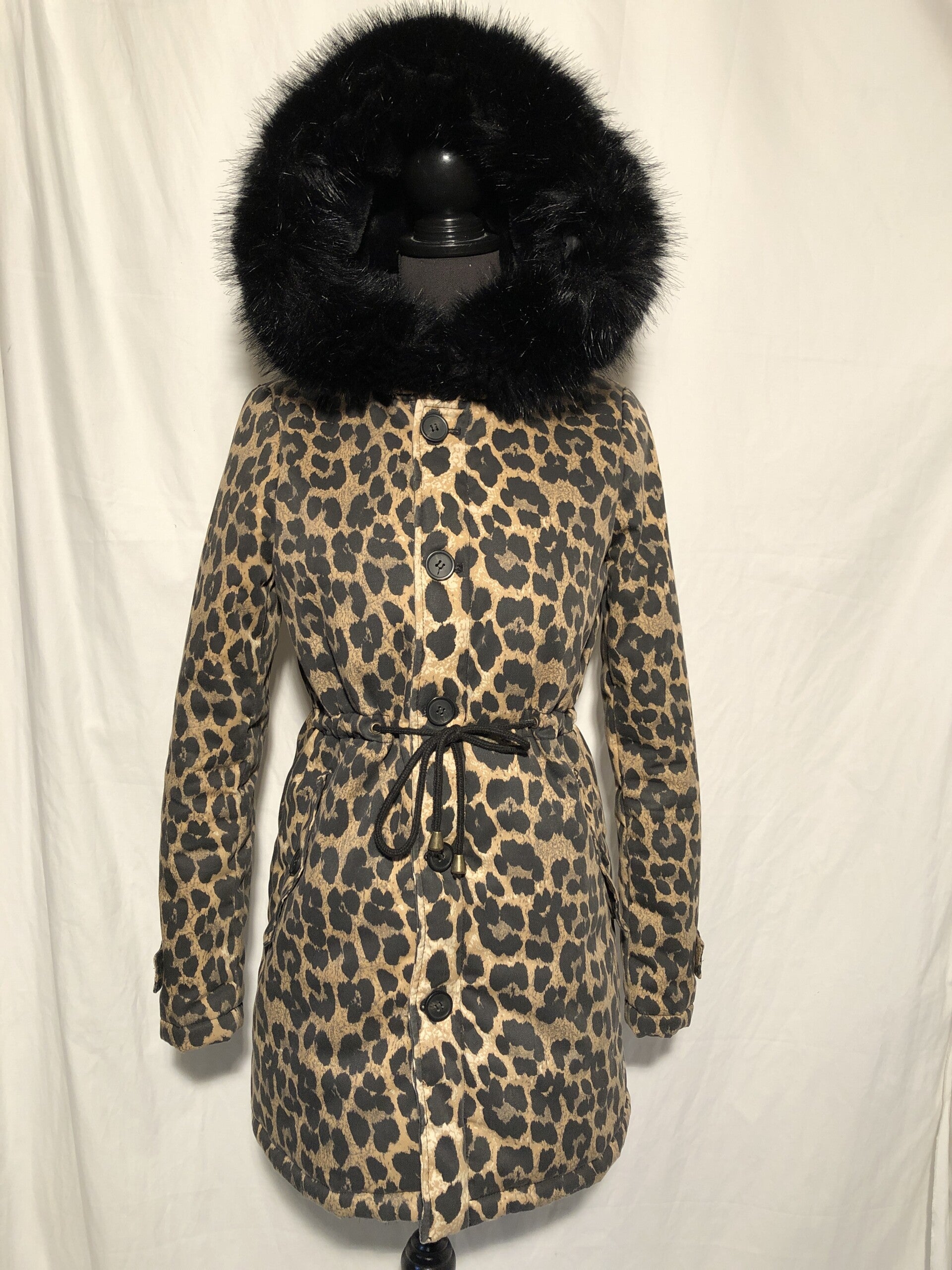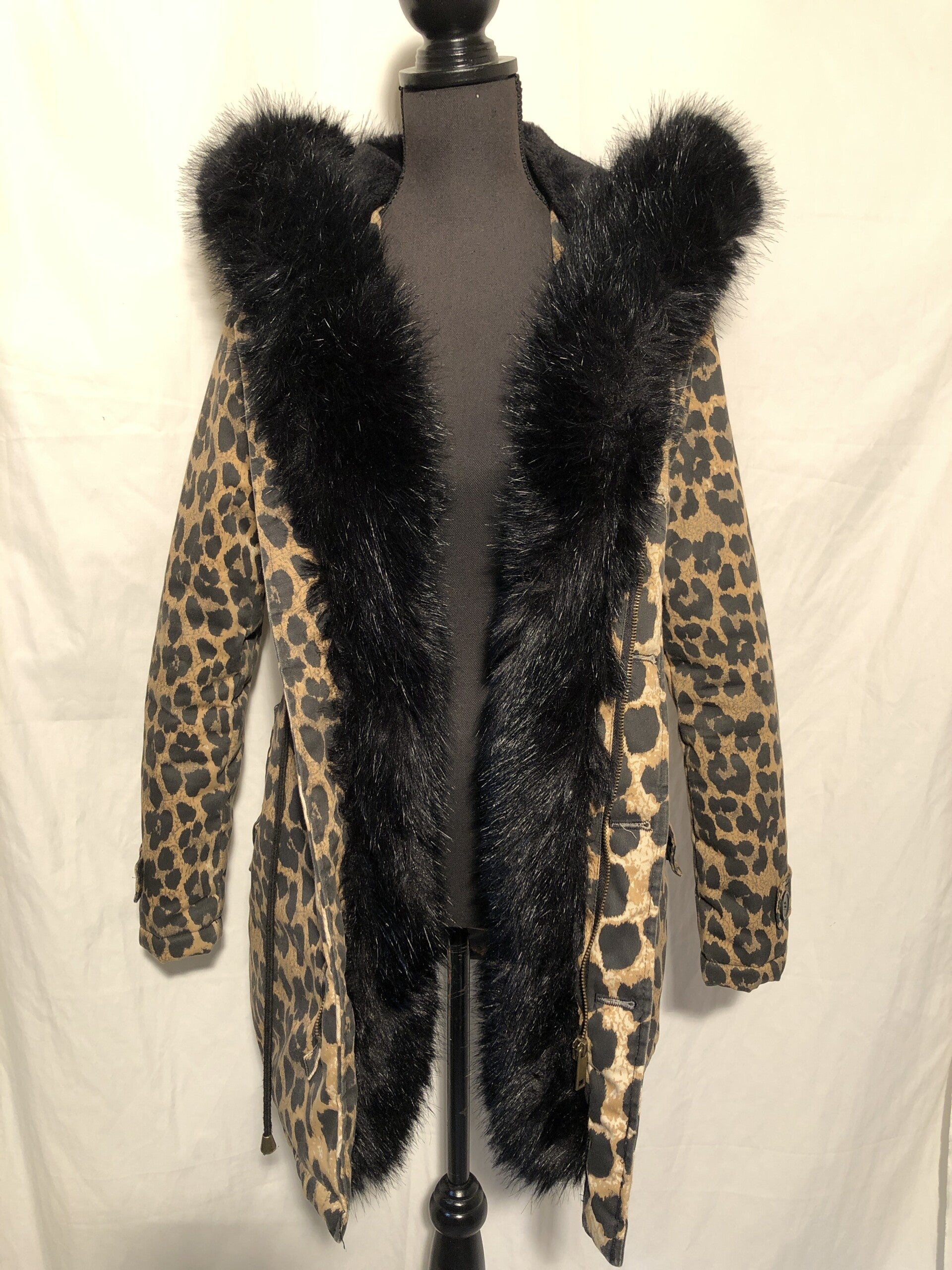 Tijgerprint winterjas met zwarte fake fur kraag en gevoerde capuchon maat M