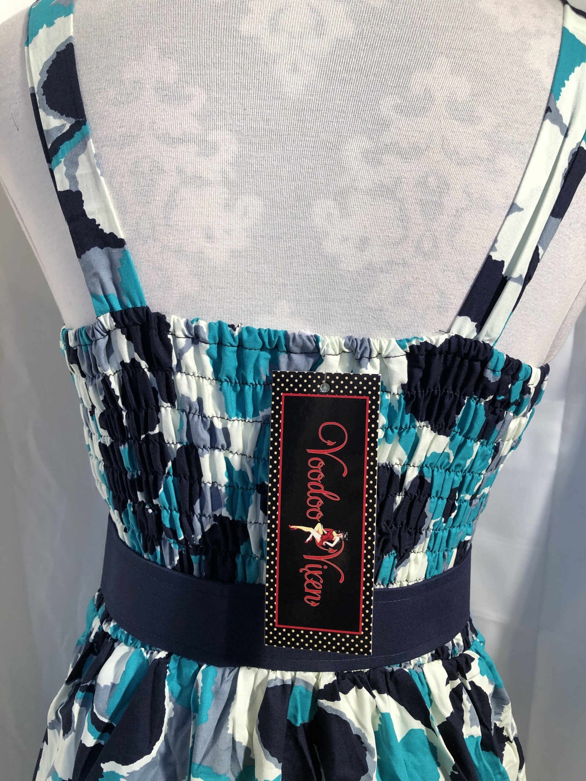voodoo Vixen blauw/groen/wit gebloemde retro jurk met riem maat M