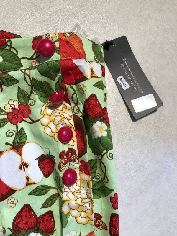 Voodoo Vixen groene retro rok met appels bloemen en aardbeien maat M