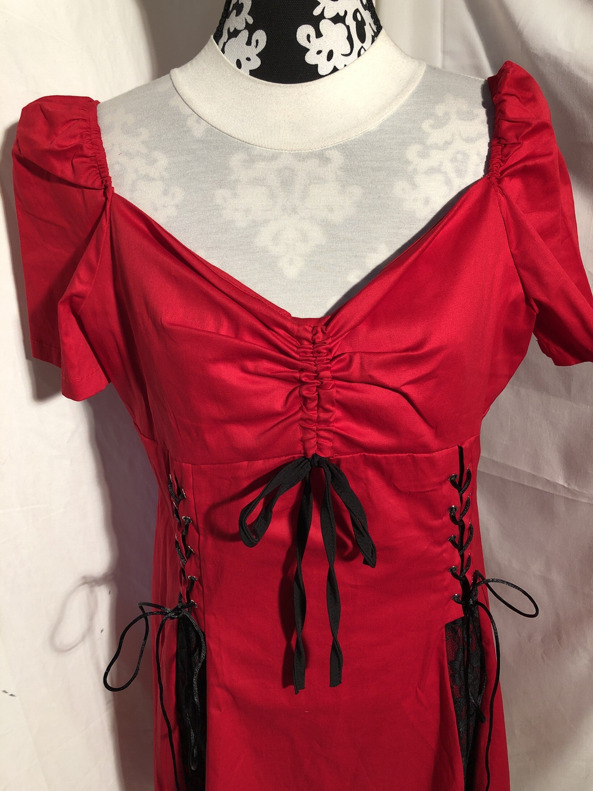 Rood retro swingdress met zwart kant en strikjes maat XL