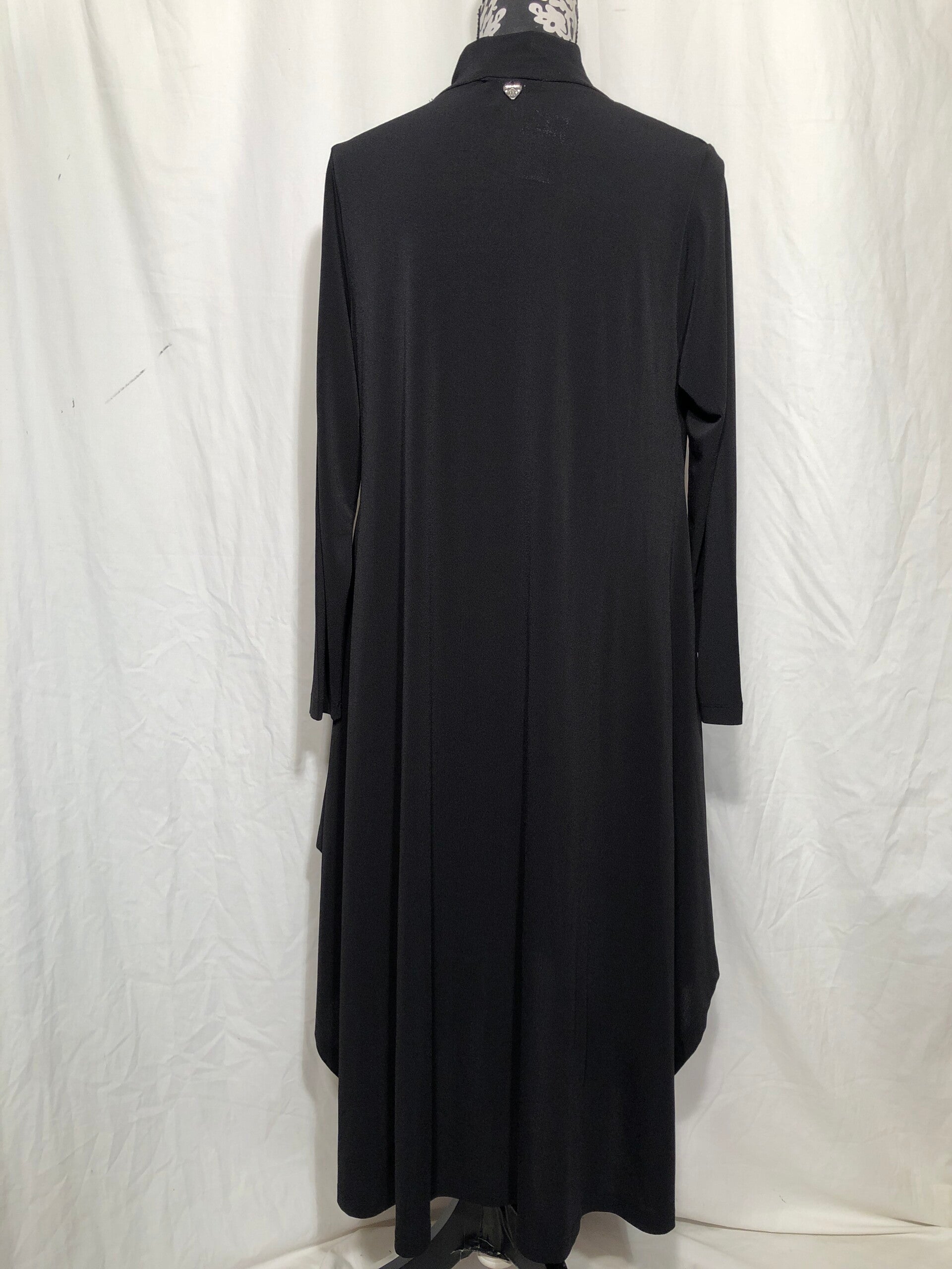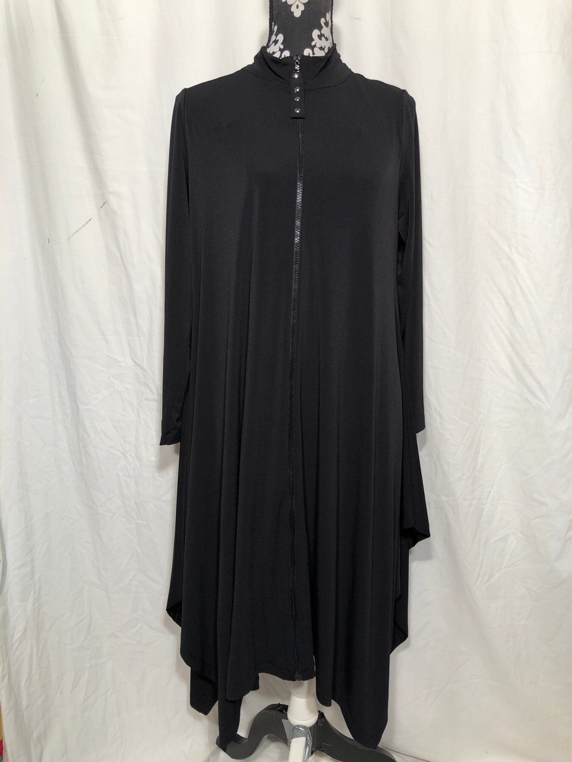 Mat zwart lange soepelvallende jurk met rits op de voorzijde maat 48/50