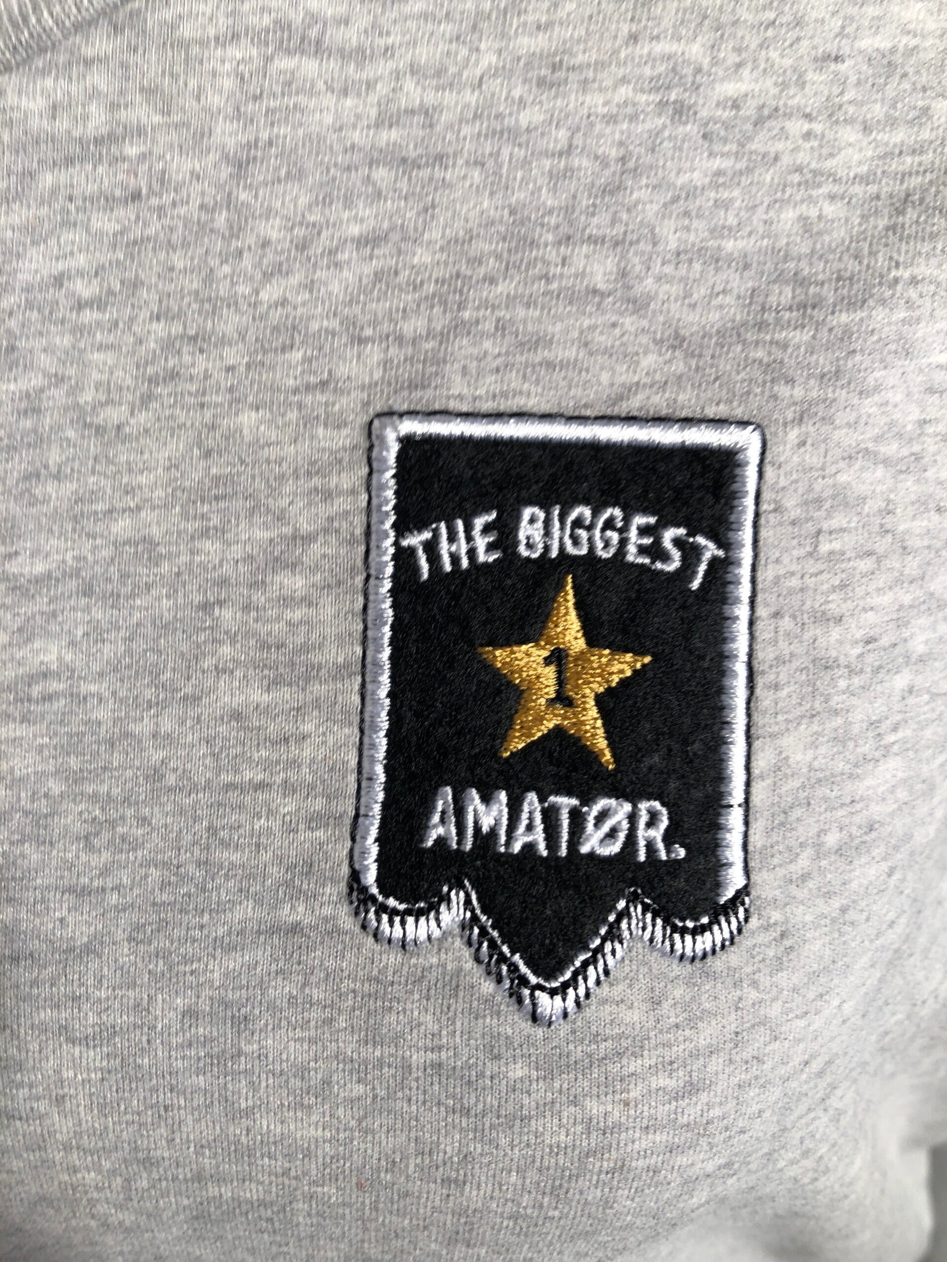 Amatør grijs dunne sweater met applicatie op de borst maat M