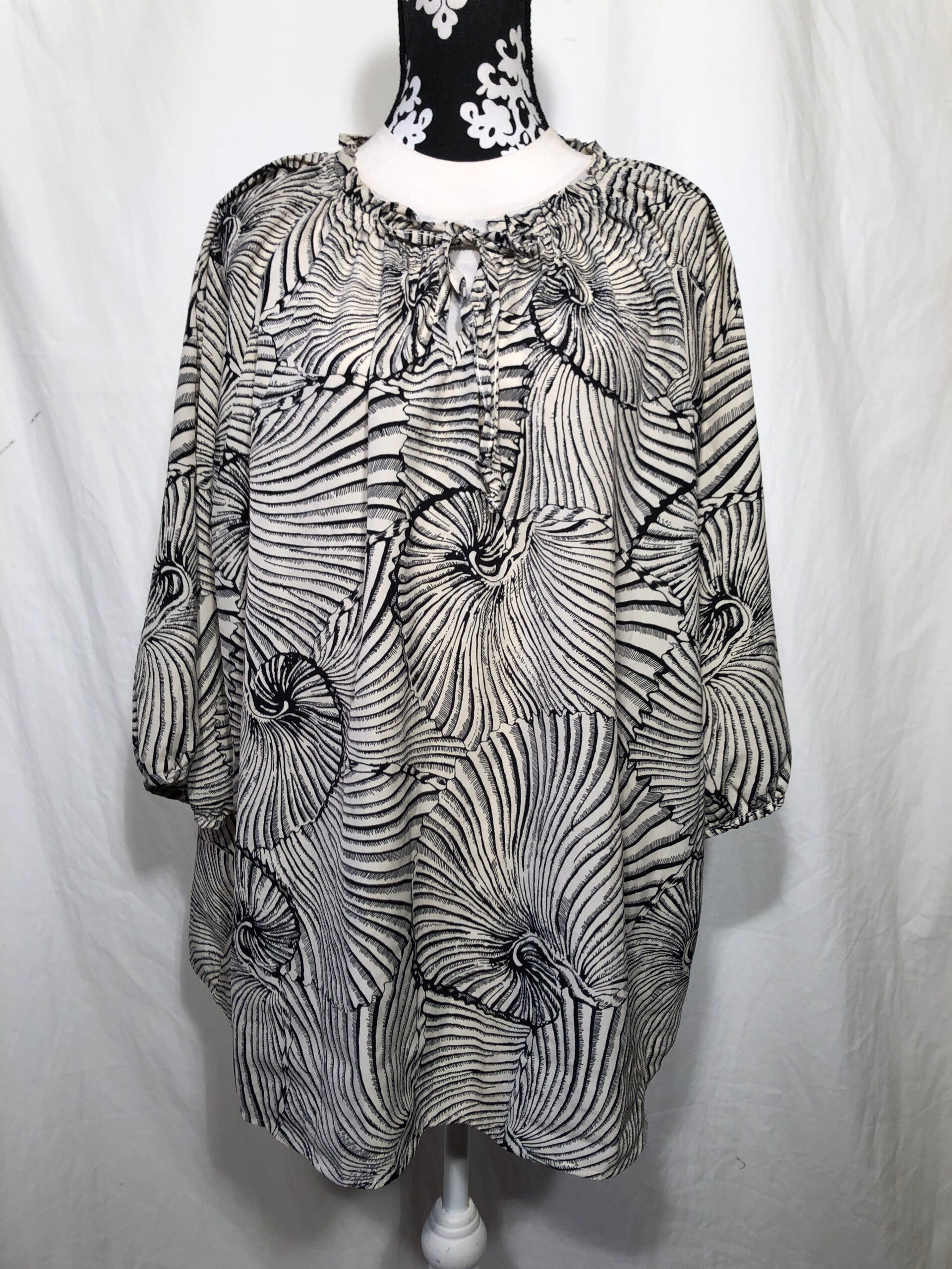 Norah zwart/crème print tuniek met elastiek in de kraag en strikje maat 48