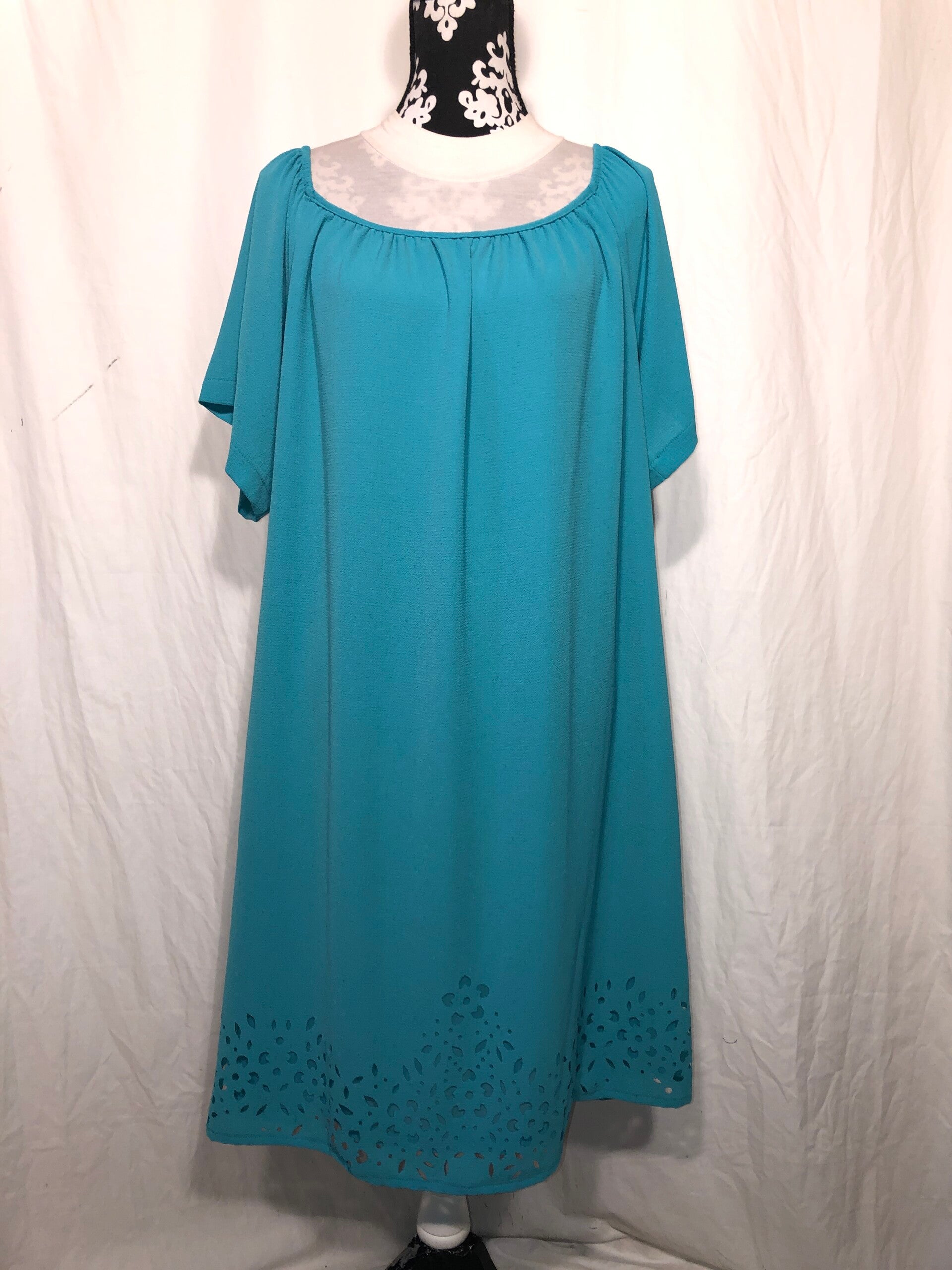 Mat mintgroene jurk met uitgestanst werkje aan de onderzijde maat 44