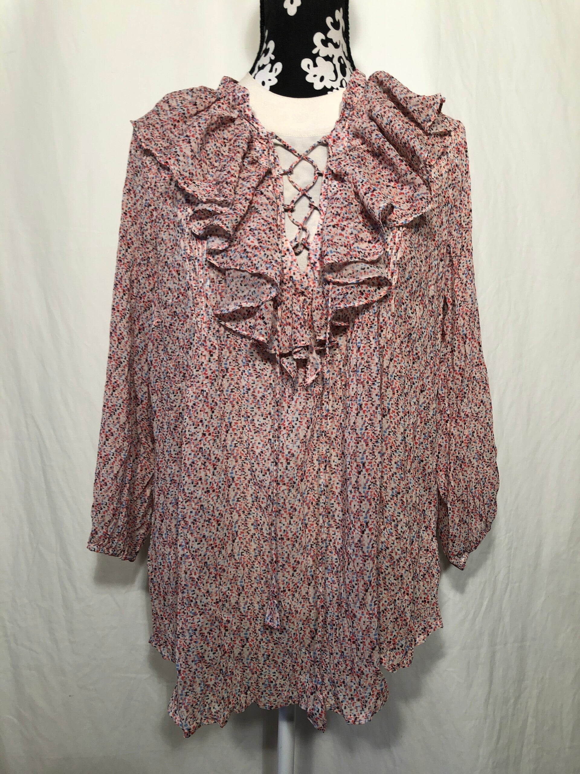 Open End meerkleurig print tuniek met ruches en kruisbandje op de buste maat 44/46